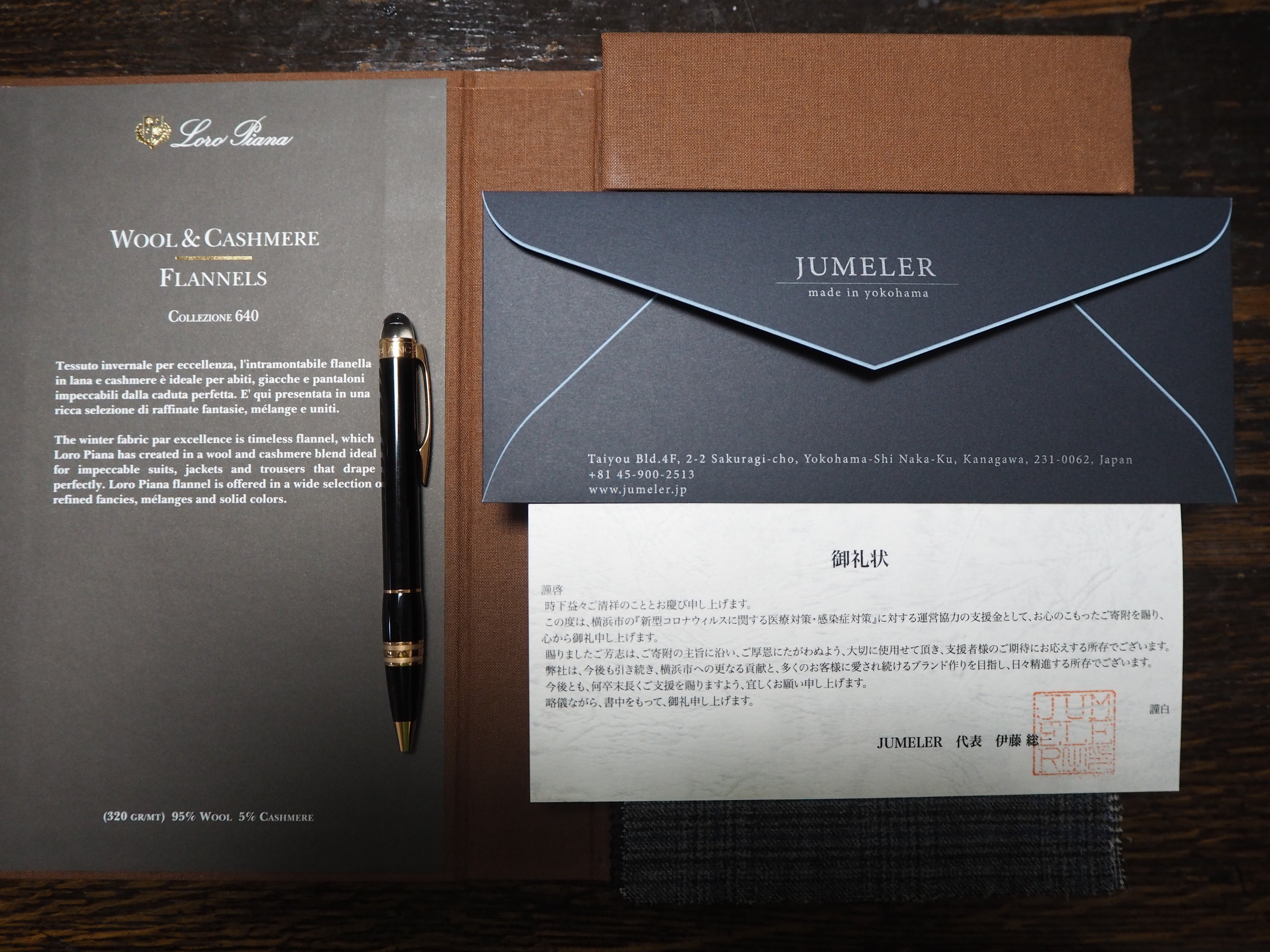 弊社のオーダースーツをご購入頂いた(個人様・法人様)販売収益を(3000円/1着)横浜市が新設した『新型コロナウィルスに関する医療対策・感染症対策を応援』という窓口に寄付をさせて頂く取り組みです。
