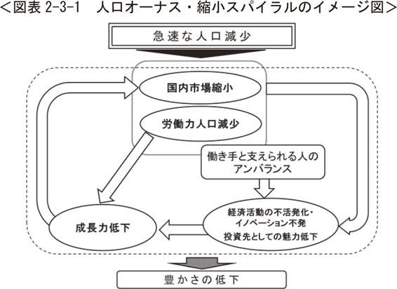 また、急速な人口減少が、国内市場の縮小をもたらすと、投資先としての魅力を低下させ、更に人々の集積や交流を通じたイノベーションを生じにくくさせることによって、成長力が低下していきます。加えて、労働力不足を補うために長時間労働が更に深刻化し、ワーク・ライフ・バランスも改善されず、少子化が更に進行していくという悪循環が生ずるおそれもあります。
