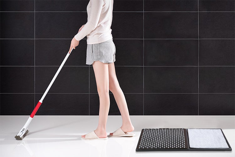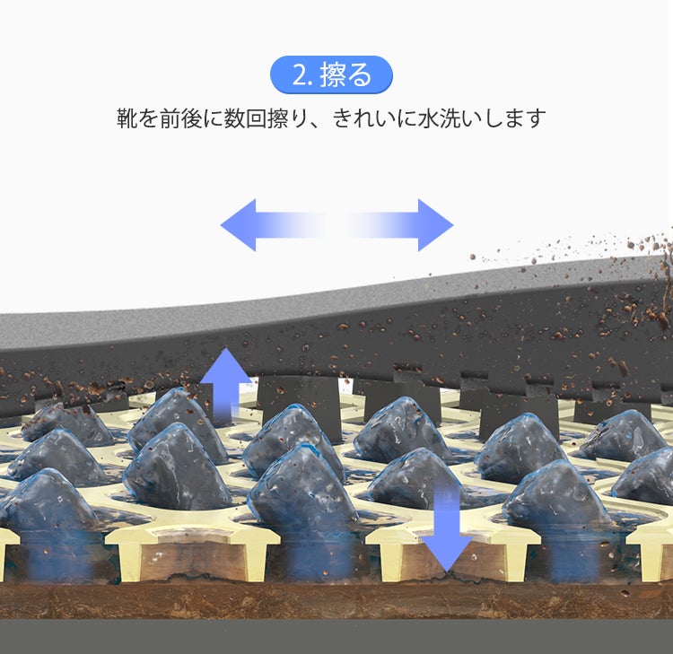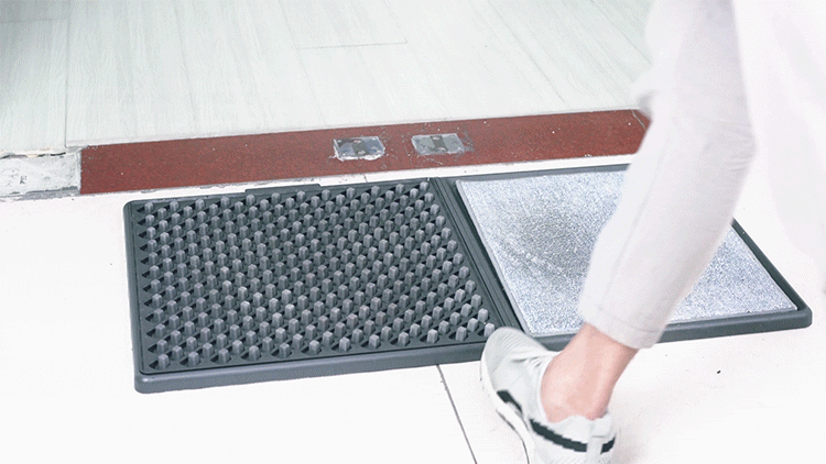 一般的なエントランスマットは砂や小石などの大きな異物を擦り落とすだけで、細かな泥汚れまでは100%落とすことができませんでした。しかし本製品は、靴底の圧力と水圧を使い、踏むだけで、まるで自動洗浄でもしているかのように汚れが除去できます。
