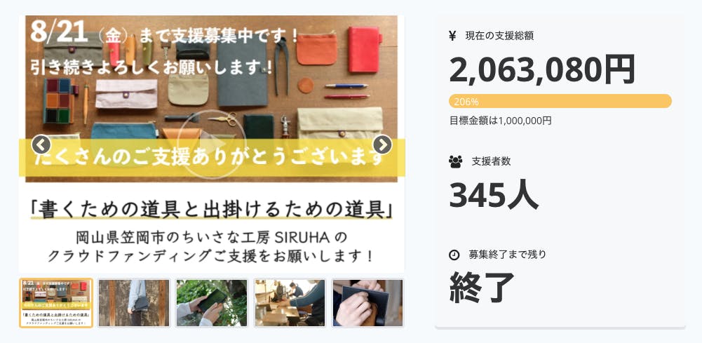 2020/08/22 13:20昨日、ご支援を募集していたクラウドファンディングが終了いたしました!支援者数345名、支援総額2,063,080円目標金額を遥かに超え、達成率206%という想像を超える結果となりました。皆様にご支援をいただいたおかげで、さらに多くの方から注目していただくこととなり、このような広がりが生まれました。ご支援いただき本当にありがとうございます! スタッフ一同、心より感謝申し上げます。開始から1週間足らずで達成率50%を超えたとき、なんとしてでもこの仕事を続けていかねばと感じました。そして支援者数が増えるたびに、皆様に応援していただいているという安心感と心強さが大きくなっていきました。想う道を進んでいき、少しでも皆様のお役に立てるモノとコトをお届けできたらと思っています。これからリターンの準備を進めていき、順次お届けをさせていただきます。またあらためて準備の進み具合などもお知らせしていきます。それでは、引き続きよろしくお願い致します! もっと見る