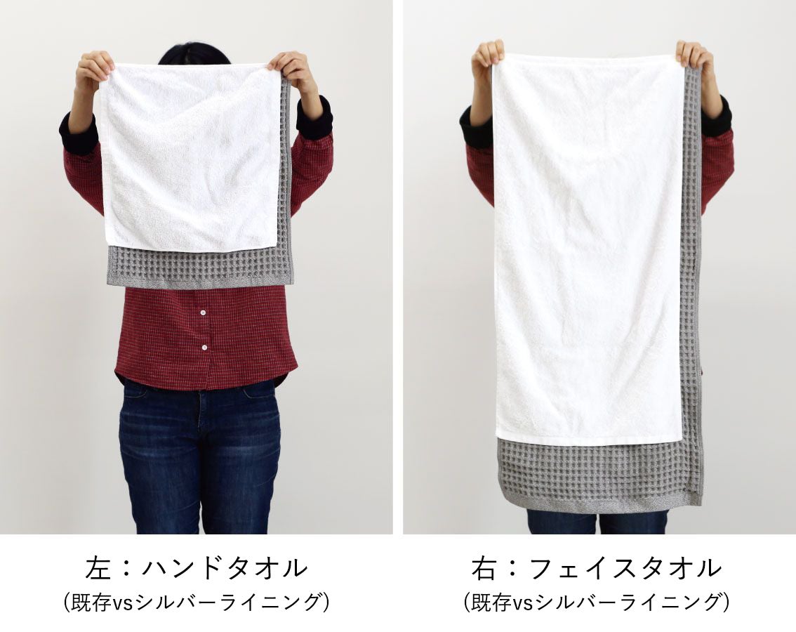 従来のサイズでは叶わなかったことを可能にするシルバーライニングフェイスタオルは、成人男性(20~40歳)のウエスト平均(へそ周り83cm)を覆うことができるサイズです。