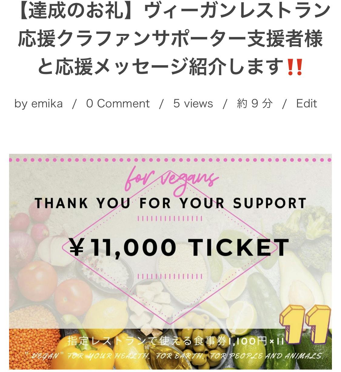 2020/08/31 12:30「チケット使いました!」と、いろんな方からご連絡いただいており、嬉しいご報告をいただいております。全体支援の方で、お名前の公開がOKな方をベジフォーピースホームページでご紹介させていただきました。また、他の皆様からクラファンページ上でいただいた応援メッセージもご紹介しています。よろしければ、ぜひご覧ください。ホームページでご案内しておりましたが、ベジフォーピースとして、コロナ支援の活動はこれで最後となり、ヴィーガン普及プロジェクトとして活動していきます。また、ベジフォーピースは農林水産省の「あふの環プロジェクト」のメンバーとなりました。来月には農林水産省のサスティナブルを推進するキャンペーンを企画しており、皆様からの応援の言葉を励みに、人にも地球にもやさしい食事を広く普及していきます。活動の紹介につきましては、Facebook、インスタグラム、Twitter等でご紹介しておりますので、ぜひフォローをよろしくお願いします!https://mirai-sanpo.com/https://www.facebook.com/groups/2642866892650403/?ref=sharehttps://mobile.twitter.com/vegepeacehttps://www.instagram.com/vegeforpeace/ もっと見る