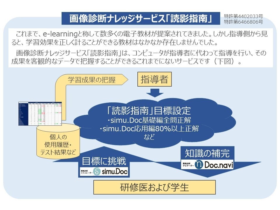 これらの「画像診断知識ベース」「症例データベース」から知識(ナレッジ)を的確に取り出すことを目的とし、“画像診断ナビゲーター(Doc.navi)” と “画像診断シミュレーター(simu.Doc)” を開発しました(下図参照)。その結果、”画像診断ナレッジサービス「読影指南」”は初学者から専門医を目指す医療従事者に対して以下の機能が提供できます。