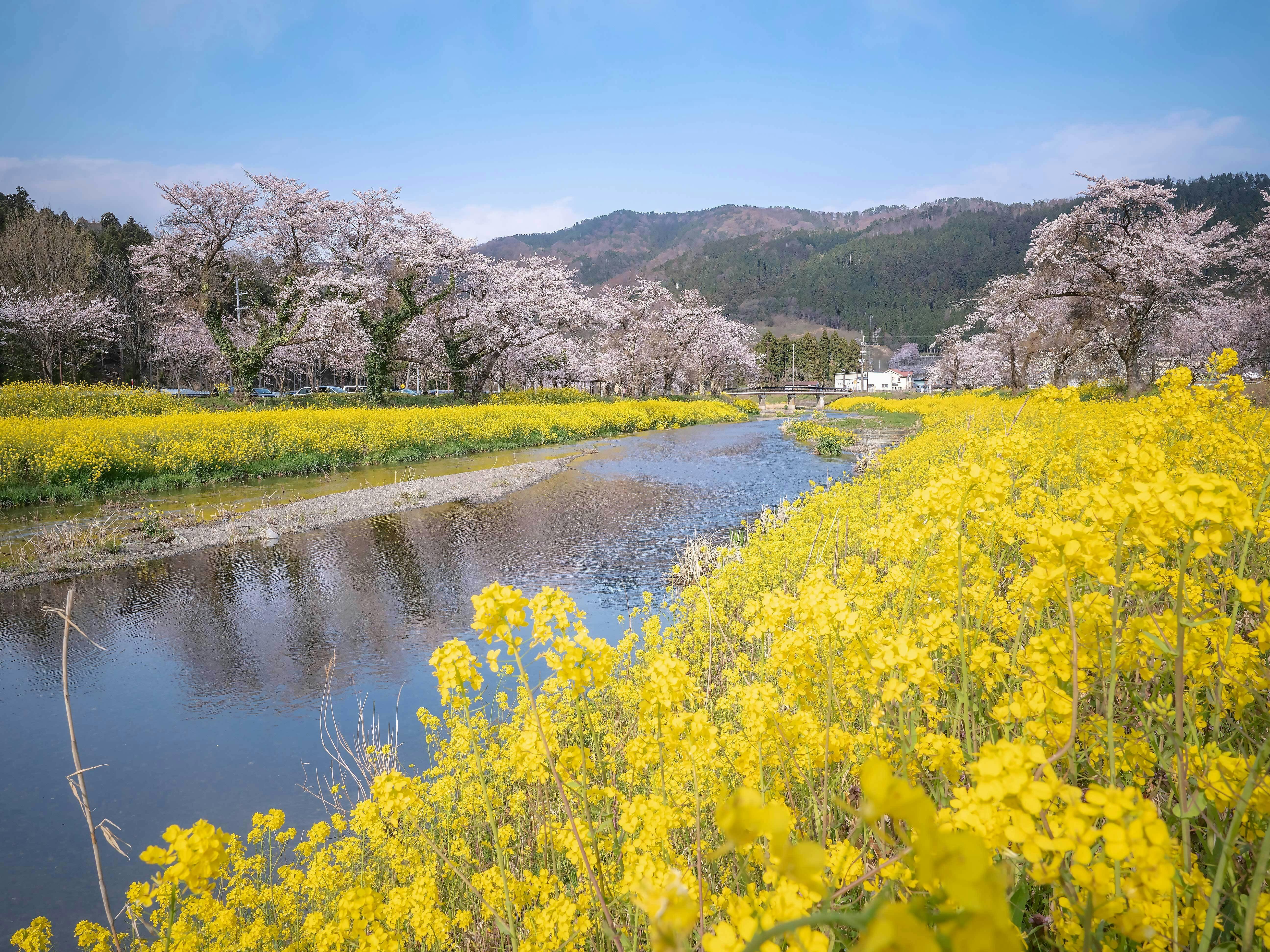 ▲いも洗いした余呉川は春になると菜の花と桜で美しい。
