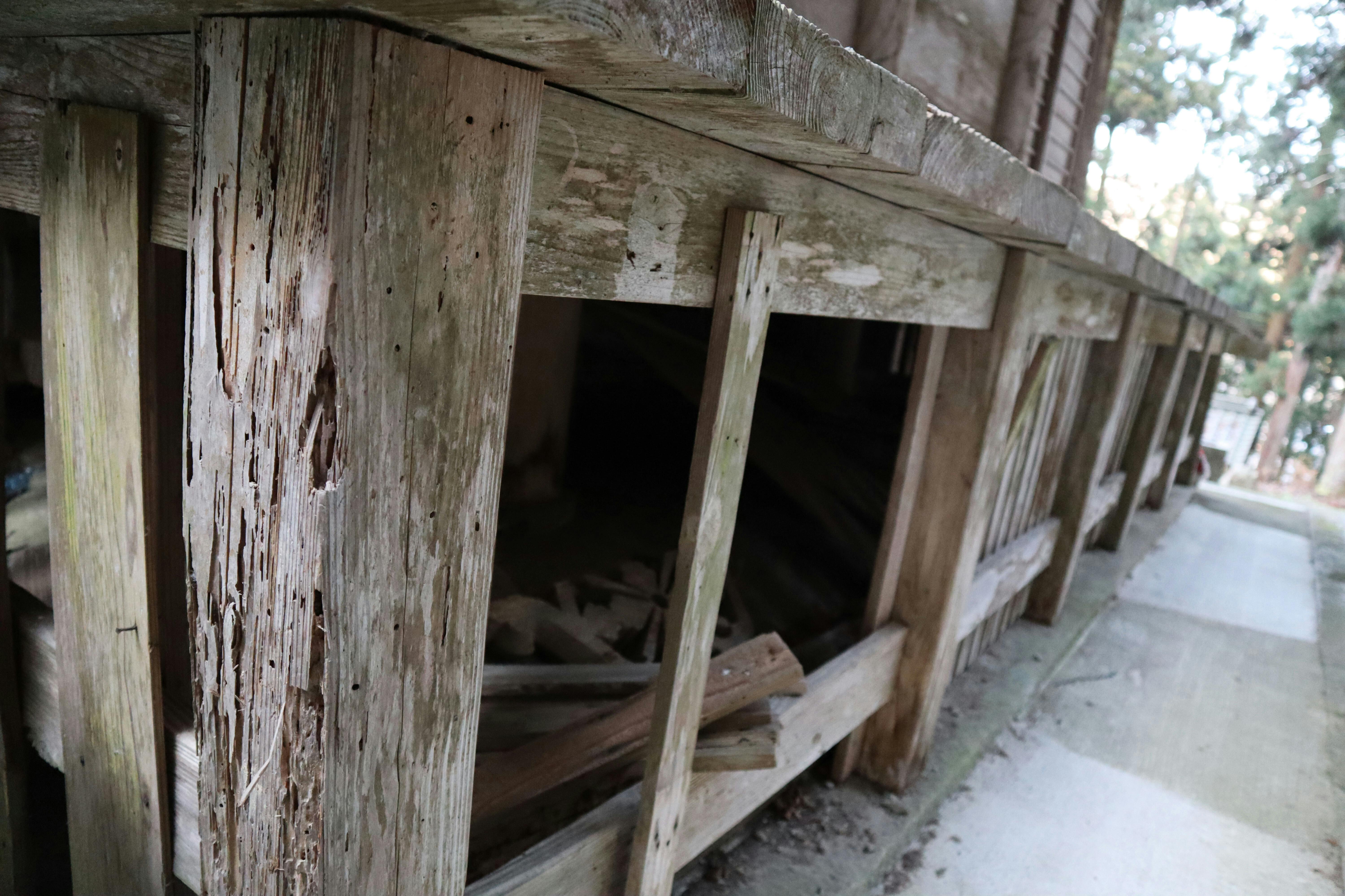長年の風雨にさらされ、階段や床はカビてきてしまっていますし、縁束は腐り折れてしまっています。