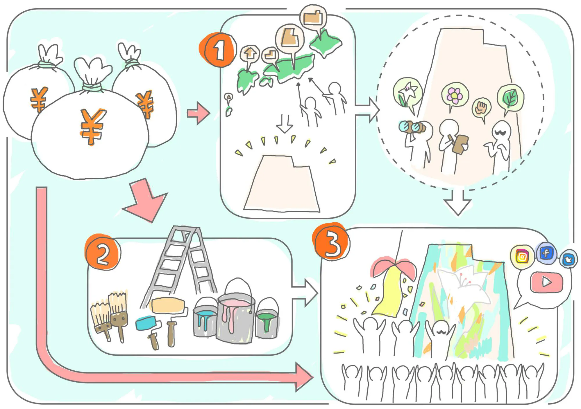 ・その①壁面の募集と、②ペイント実行の費用、③発表会費用を募集させていただきます。日本をポジティブにするプロジェクトにぜひお力をお貸しください。