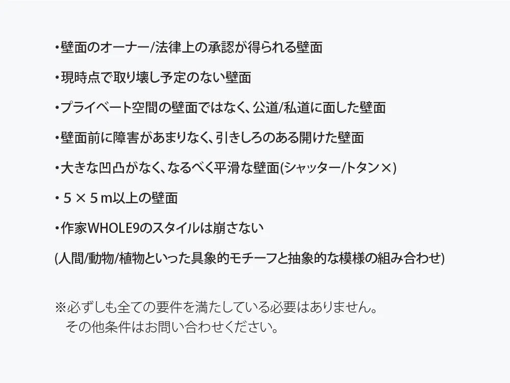 現状で東京/大阪に可能性のある壁面を保留していますが、下記要件を満たしている壁面を同時に広く募集し、優先的に採用させていただければと考えています。