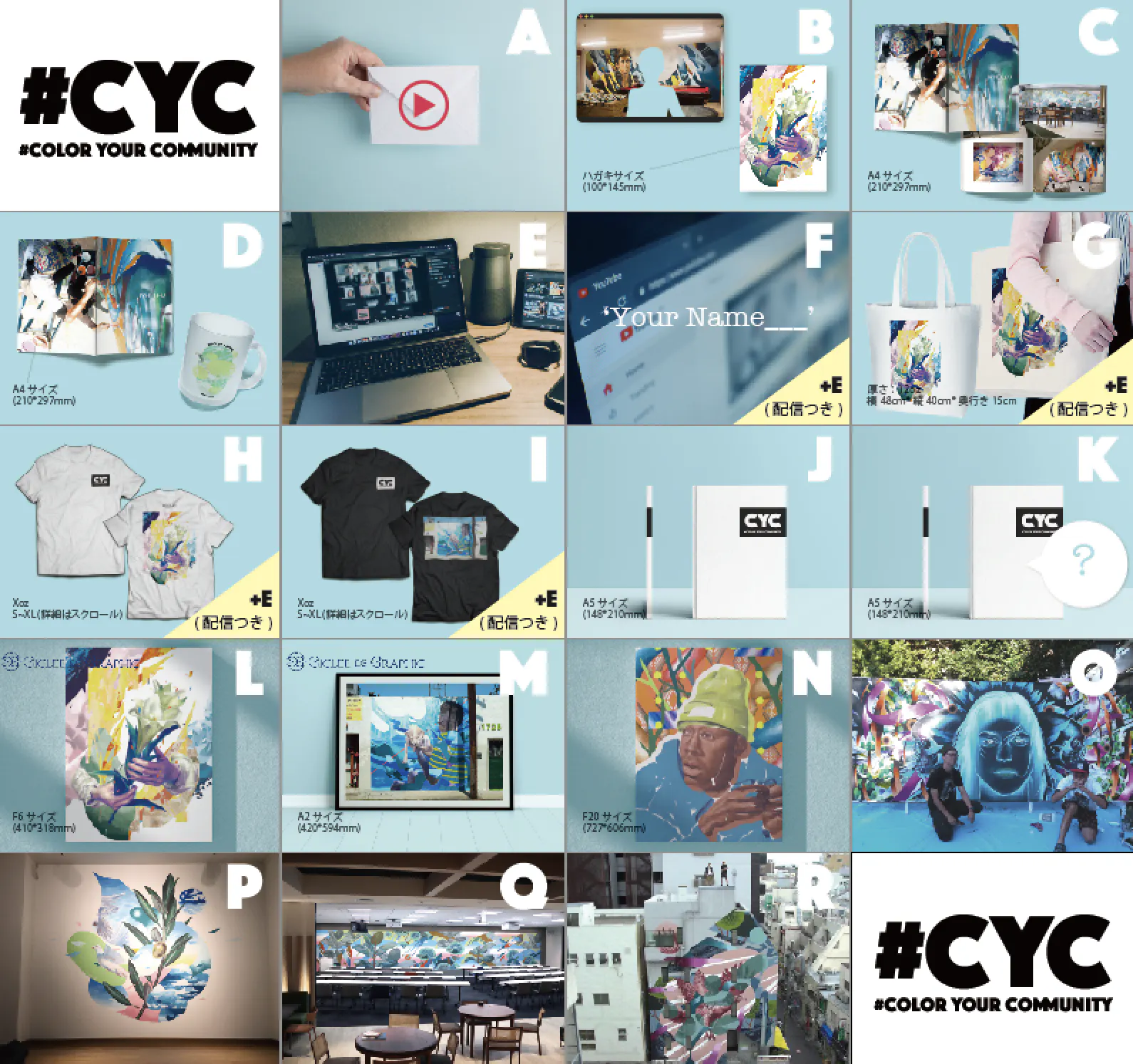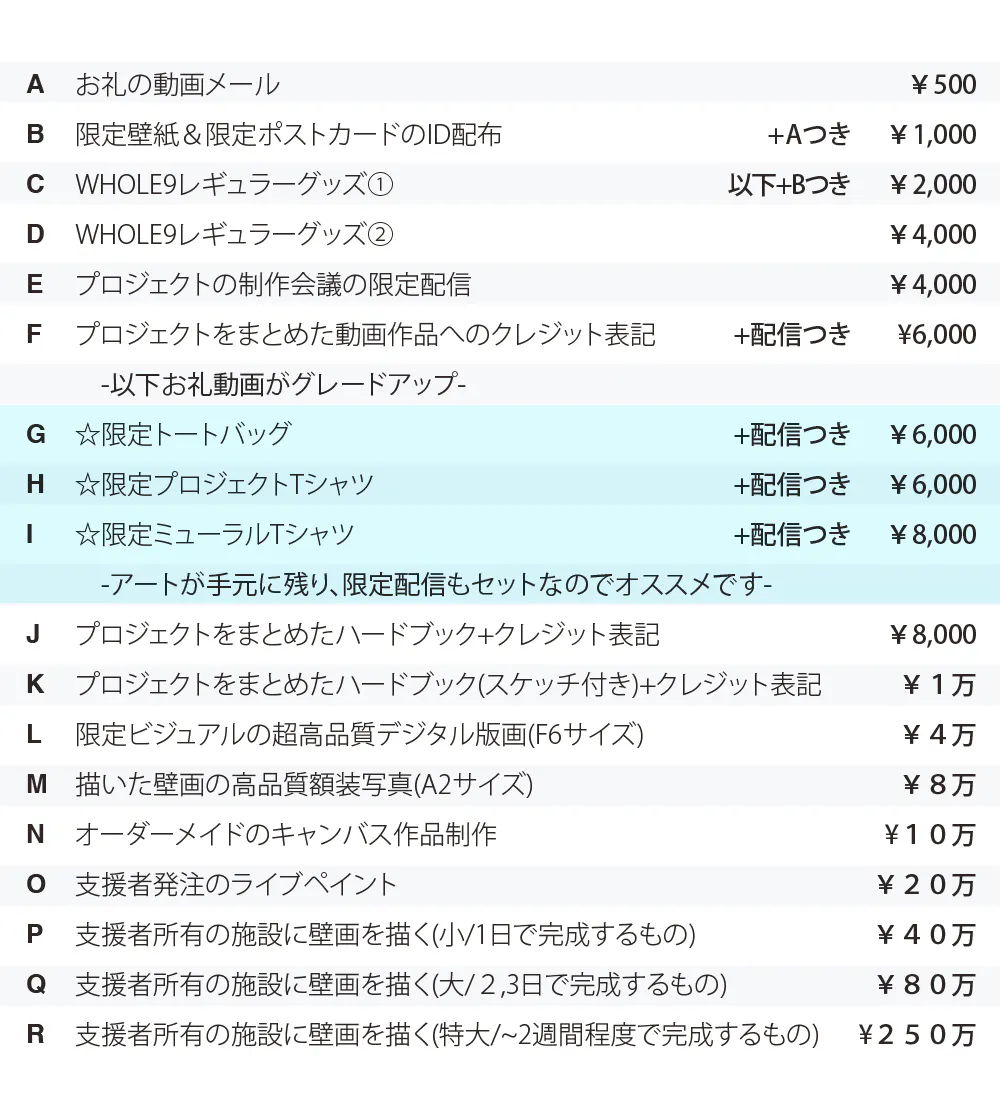 この機会にしか手に入らない特別なオリジナルグッズや作品の数々、制作に関する情報のクローズドでの配信、ライブペインティング/壁画制作など、様々なものをご用意しました!日本をポジティブにするプロジェクトにお力をお貸しください!