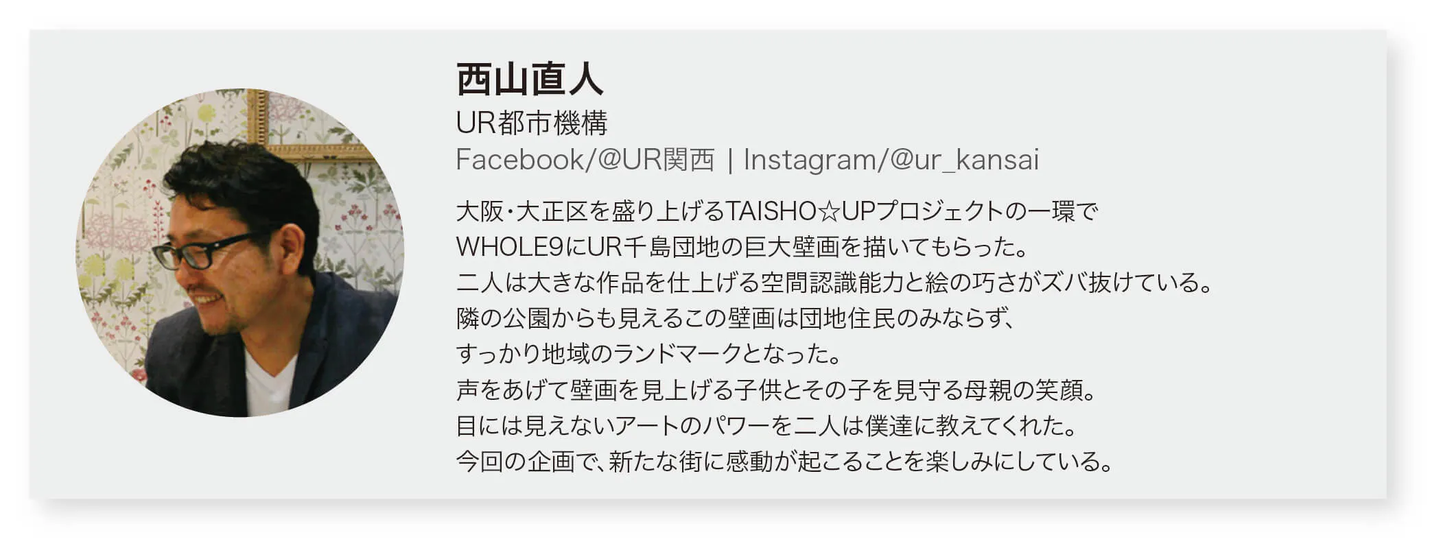 ミューラルは個人所蔵のアートと違い、街/コミュニティ共同の財産だと私たちは考えます。そこに住む人たちに寄り添うポジティブなメッセージを孕んだ壁画アートは、日々の暮らしに少し上を向かせる前向きな効果を持っています。