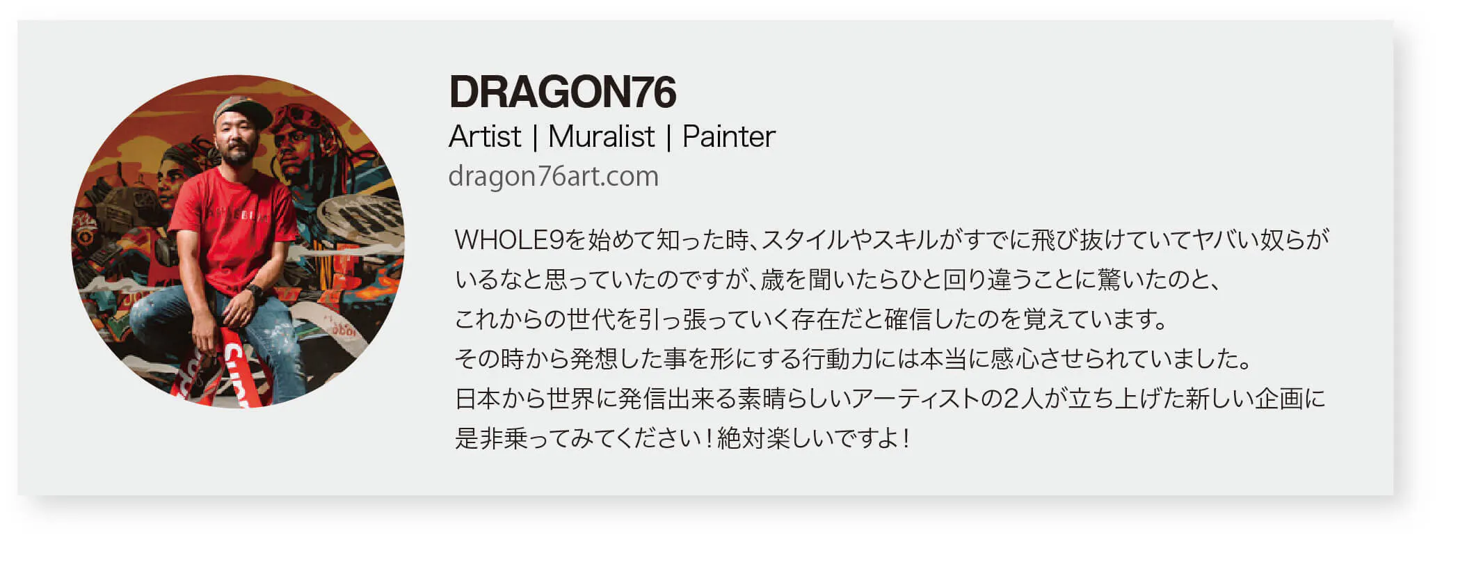 ご覧いただきありがとうございます。私たちは大阪を拠点にライブペインティング/壁画制作を行うアーティストデュオ'WHOLE9 -ホールナイン-'です。hitchとsimoの二人組で、ストリートアートをベースに2人で1枚のミューラル(壁画)を、これまで13年間に渡って各国/各地で描いてきました。