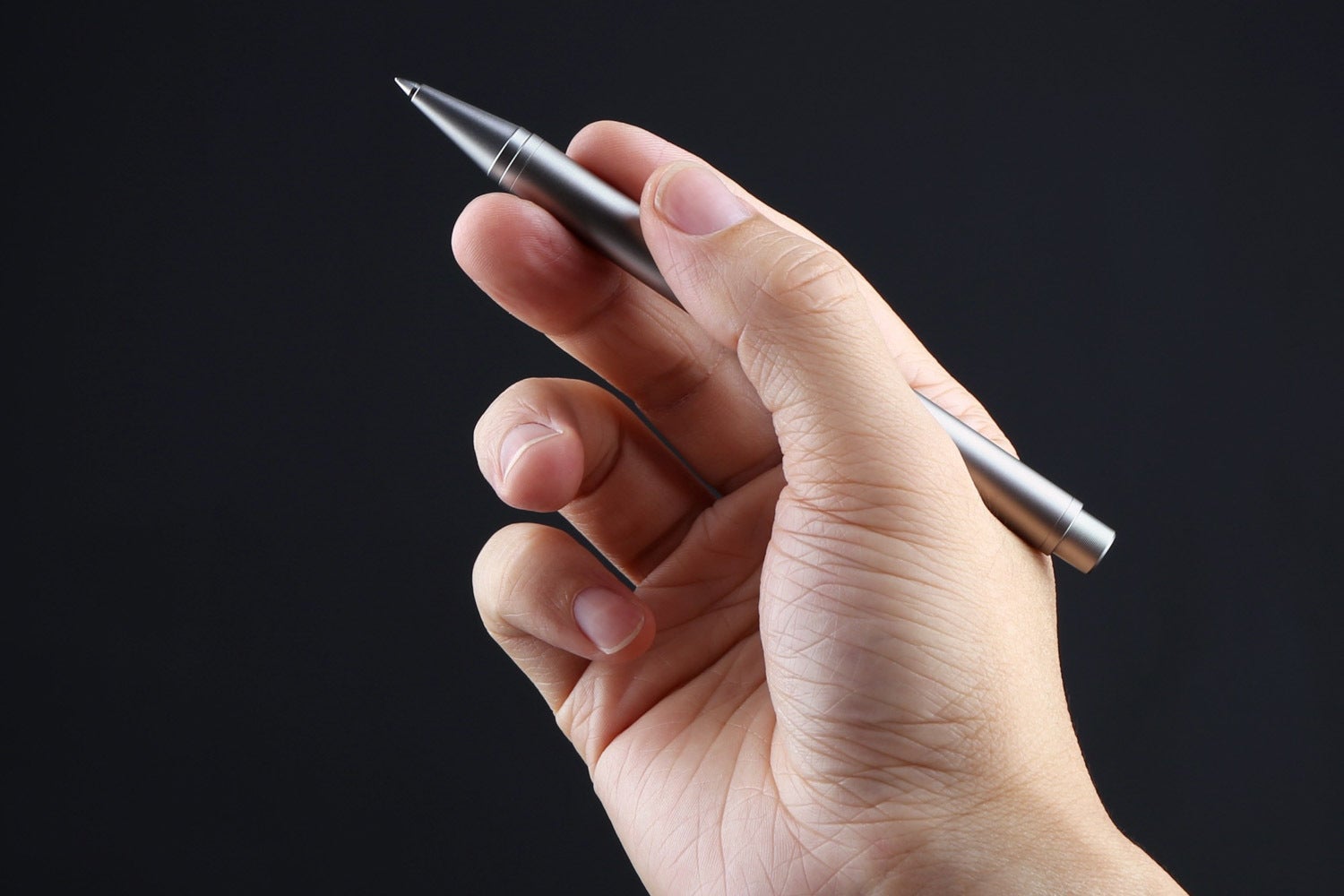 TP1には、普通のボールペンにあるようなクリップもグリップ部分も存在しません。あるのはチタンのユニボディとペン先と、ペン先を繰り出すためのノック部分のみです。