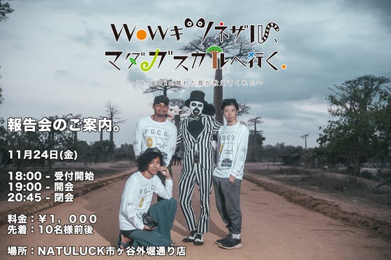 • あまり、WoWキツネザルです! この度は「WoWキツネザル、マダガスカルへ行く」にご支援いただき、誠にありがとうございました。 おかげで私の夢でもございました、マダガスカルへ行くということができました。 これはご支援、応援いただきました皆様のおかげに他なりません。 今回の旅で私は、マダガスカルの魅力を存分に味わい、本来のマダガスカルの姿を見て感じることができました。 魅力だけではなく、解決すべき課題にも触れることができました。 ドキュメンタリーの完成は今年中を予定しておりす。LINEスタンプ、ステッカー、お土産につきましても今年中の発送を予定しております。 お待たせして大変恐縮でございますが、今しばらくお待ちくださいませ。   そして、きるけ。が撮影したマダガスカルの素晴らしい写真を観ながら、今回の旅についての報告をさせていただく、報告会の日程が決まりましたのでご案内させていただきます。 すでに、プレミアムチャレンジコース、報告会ご招待コースのご支援者様のご予約をいただいておりますが、お席に若干の余裕がございます!(現在ご参加いただいている方は40名様ほど) 報告会の最後には、ドキュメンタリームービーの予告版を世界初公開します! そして、 報告会限定で「オリジナル写真集を10冊のみ¥1,500で販売致します!  【「WoWキツネザル、マダガスカルに行く」報告会】 ▼日程: 11/24(金)  ▼受付: 18:30~(30m) ▼報告会: 19:00~20:50(120m) ▼場所: NATULUCK市ヶ谷外堀通り店 ▼住所:東京都新宿区市谷田町2-19-1 NBC市谷田町ビル3階 GoogleMap  東京メトロ「市ヶ谷駅」5出口から徒歩3分 JR「市ヶ谷駅」出口から徒歩7分 都営地下鉄「市ヶ谷駅」4出口から徒歩7分 ▼料金:1,000円 ▼定員:10名前後   そして、その後懇親会を予定しております。 【懇親会】   懇親会日程: 同日 時間: 21:30~23:30(120m) 場所: 参加者様だけにお伝えします。 ※報告会終了後、懇親会を開催いたします。こちらは有料となります。 料金は3,000円~3,500円の予定です。   ご参加希望の方は、 contact@wows.tokyo に、 お名前と、報告会/懇親会 参加の旨をお送りください。   お待ちしております! もっと見る