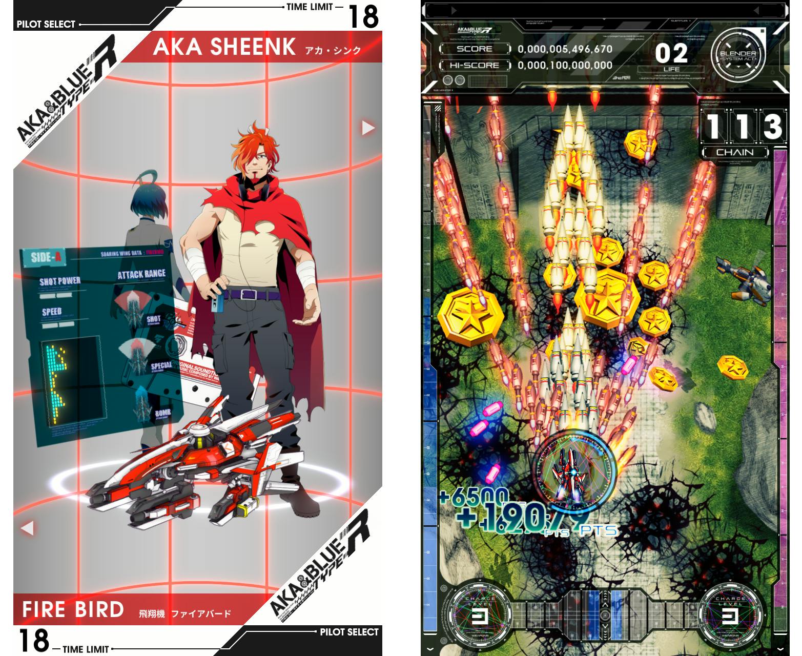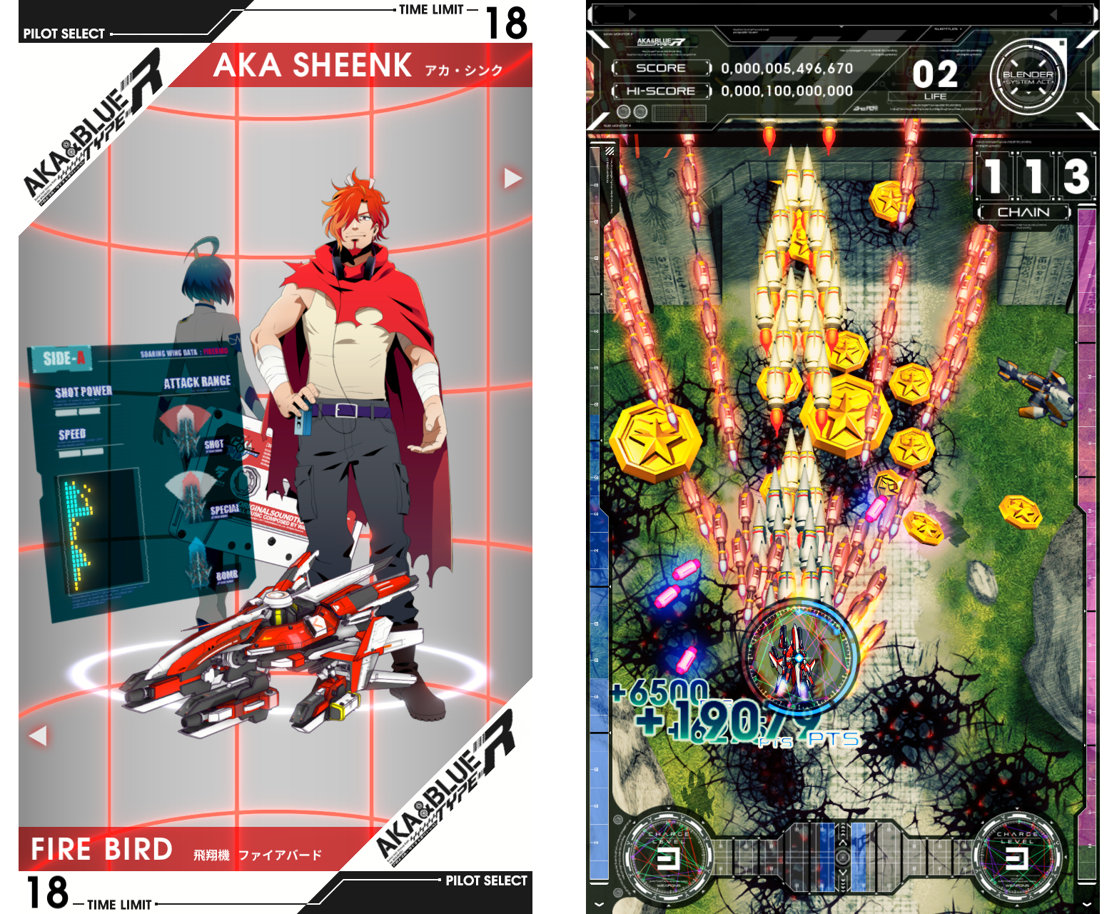 2017年8月10日より配信されているスマートフォン向けシューティングゲーム『アカとブルー』を、好評だったゲームシステムをそのままに、コントロールパネルでも違和感なく、そして大画面で且つ大音量で爽快感あるプレイが行えるようフルリメイク。ネットワークを介しての従量課金が一切無い、物理媒体のみで単体稼働できる形式で販売される約7年ぶりの新作業務用向け縦スクロール型シューティングゲームとなっている。