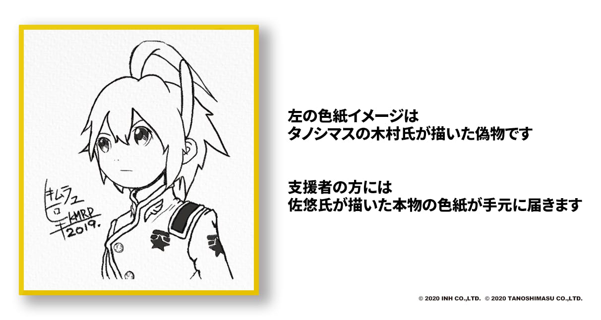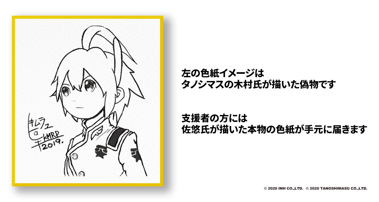 アカとブルー キャラクターデザイン担当 イラストレーター 佐悠氏による直筆イラストを色紙に描いていただき、郵送にてお手元にお届けします。