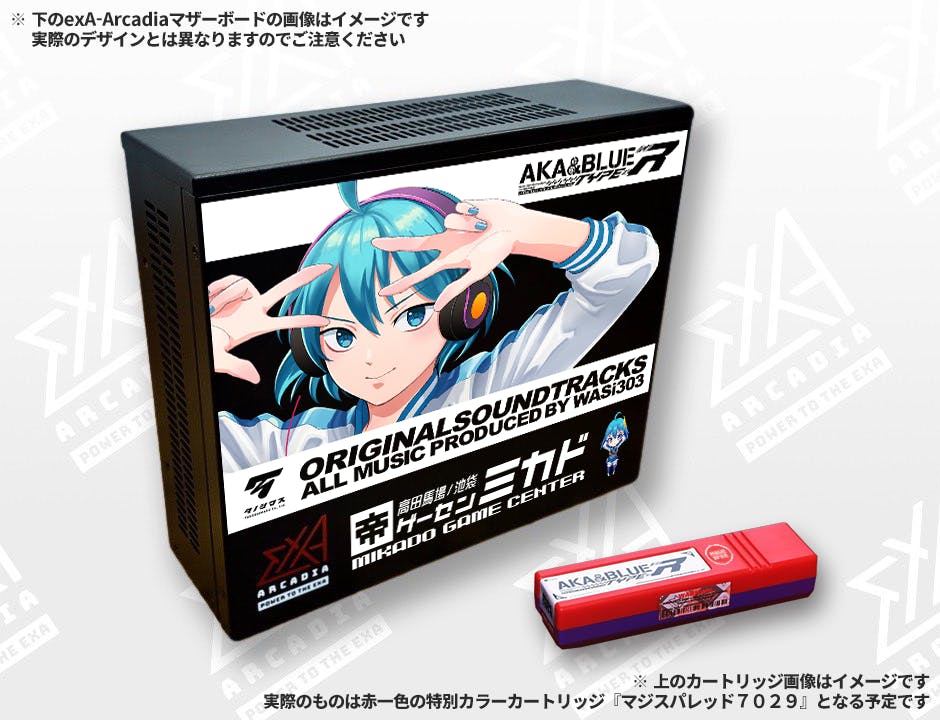 『アカとブルー タイプレボリューション Ver.MAGIC SPICE ホームエディション』のゲームカートリッジおよびオリジナルイラストがプリントされた『exA-Arcadiaマザーボード WASi303 Limited』はこのクラウドファンディングでのみ入手できる特別版となります。