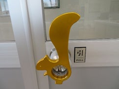 丸型のドアノブは握らないと開けることが出来ません。そこで手のひらからの接触感染防止の観点から、不特定多数の人が触るドアノブを手首を使って開けることが出来るよう、丸型のドアノブにアドオンするグッズを開発しました。