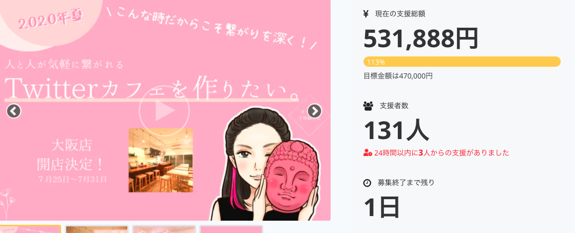 2020/07/23 11:42今回のTwitterカフェプロジェクトですが皆さまの本当に温かいご支援、応援を頂いて達成をする事が出来ました。本当に本当にありがとうございます。たくさんの方に支えて頂いて、ここまでこれた事心から感謝の気持ちでいっぱいです。プロジェクト掲載終了まで残り1日となりましたがここからの支援金は、来店してくださった方へ還元していきたいと思っております。支えてくださっている皆さまに、感謝の気持ちを込めてプロジェクト達成のご報告とさせて頂きます。残り1日、まだまだ頑張って参りますので温かく見守って下さったら嬉しいです。さゆ姉 もっと見る
