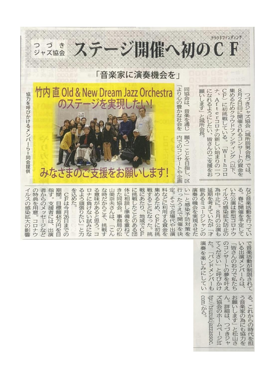 2020/07/09 22:34今日のタウンニュース一面のトップにご掲載頂きました!感謝です!8/2(日)イベント本番まで、残り24日!COVID-19(新型コロナ感染症)の感染拡大は、私たちの環境を一変させました。「8月2日の『竹内 直 Old & New Dream Jazz Orchestra』のステージを断念するしかない!」と考えつつも、このステージを楽しみにして頂いている「竹内 直 Old & New Dream Jazz Orchestra」のメンバーのみなさんの落胆されるご様子が目に浮かんで、なんとか開催する方法はないかと、自粛の毎日に悶々と模索する日々が続きました。この様な時期にイベントを開催するという事で、たくさんの方々にご相談させていただきました。3月と5月のイベント同様、中止も検討しました。感染対策を徹底しても、残存リスクはもちろんあります。大切なことは、社会全体として、文化として、その様なリスクがあることを理解しつつ、このコロナ禍と戦って行く事が求められているのかもしれません。私たちジャズ協会クラウドファンディング実行委員会はコロナ禍にどのように向き合うか其々個々のミッションに応じて手段や方法が異なって良いのかと考えております。その時できる最善の選択をし続けていきたい!素晴らしい『竹内 直 Old & New Dream Jazz Orchestra』 のステージ実現の為にみなさまのご支援ご協力を切にお願い申し上げます。 もっと見る