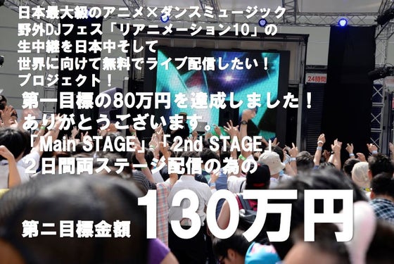 2017/06/07 20:00リアニメーション10 Main STAGE 配信が決定!第二の目標達成で「2つのSTAGE✕2日間」の生中継を配信! AniEveZ(アニイベZ)のワタナベイチローちゃんこと渡邊です。 6月6日(火)の23時ごろ、第一の目標である、80万円のご支援を達成することが出来「Main STAGE✕2日間」の配信が決定致しました、ご支援頂きました皆様のお陰でございます、誠にありがとうございます。 また、以前リアニメーションで実施されていたUstreamを用いての配信を観た方から、ご支援やプロジェクトへのご協力を頂ける事が多く、以前の配信の影響力やその実績にかなり助けられているのを強く感じております、その際のメンバーの皆様や諸先輩方に、この場をお借り致しまして、お礼申し上げます。 これで無事に配信の目標は達成されました、リアニメーション10を日本中や世界に配信する願いが叶います。 そして、これからは事前に告知させて頂いておりました第二の目標「Main STAGE 2nd STAGE 2つのSTAGE✕2日間の生中継を配信!」を目指し、さらにプロジェクトを進めて参ります。まだこれから支援します!という方もぜひご協力ください。 ■目標額130万円達成時の配信予定DJ・アーティスト一覧spacetime / Fish&Chips / Hedonist / asanoappy / kaxtupe / 銀星 / bamboo(milktub) / ハセガワダイスケ / ライブレボルト / アース・スター ドリーム / 大島はるな / elfin' / ロボライブ! / RAB(リアルアキバボーイズ)/ アニソンディスコ / tamu / MUKAI / ユウキカオル / DJシーザー / ツナ / ふくゐちゃん / ヒコク / POGI / AYa-NATiON / 松下 / poyo&machico / REDSHiFT(from INDONESIA)/ TheLASTTRAK / hirotch / ヒデヲ / ニコル / Polyphonix / Pandora / Blacklolita(Recommended by Diverse System) / UMEO / DJ SAAYA / gekko(順不同・敬称略) もっと見る