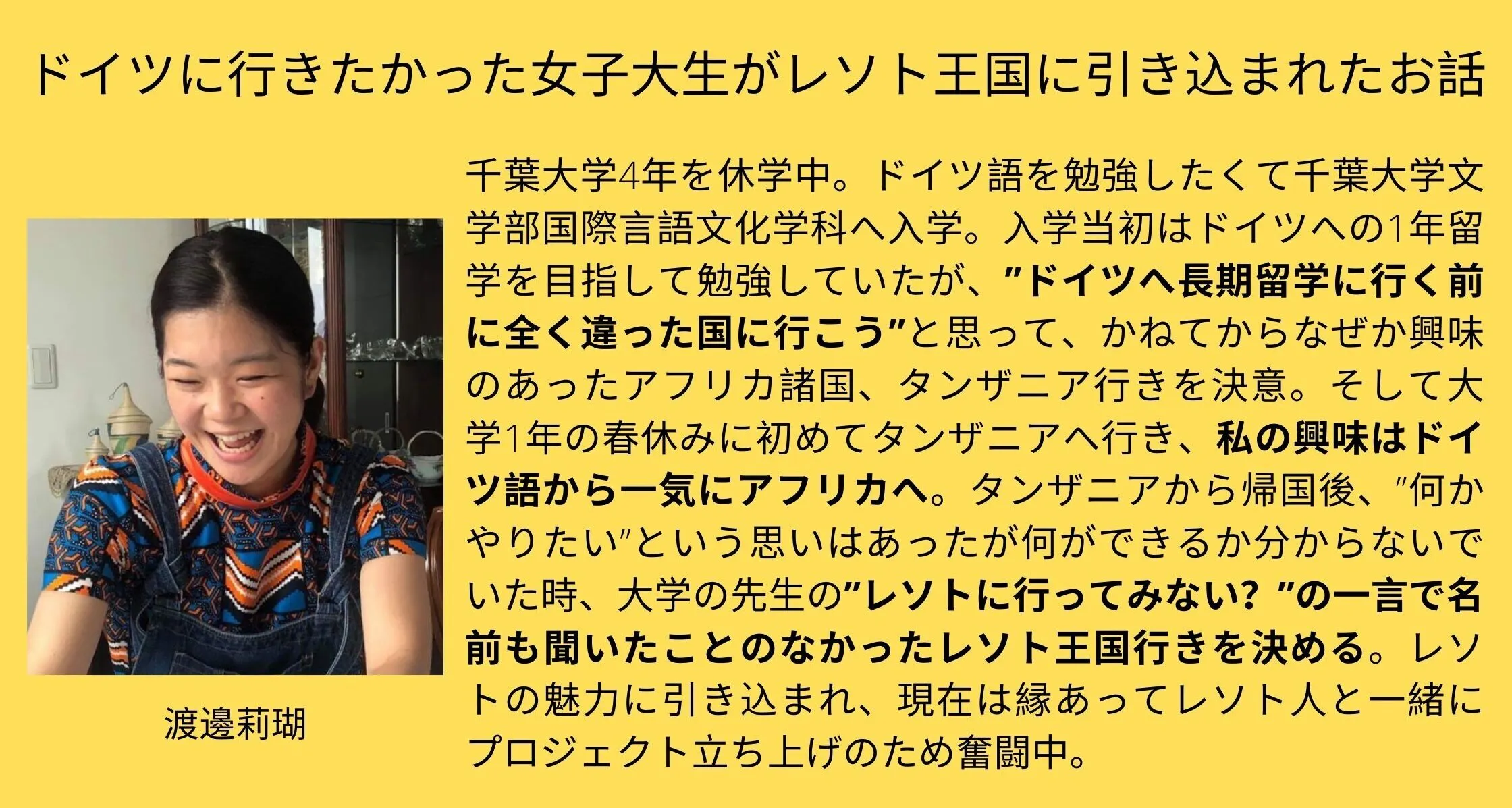 レソトでプロジェクトをやるにあたって、”レソトが日本であまり知られていない”ということがありました。でも逆に知られていないからこそ、それを活かしたことが日本でもできると考えました。