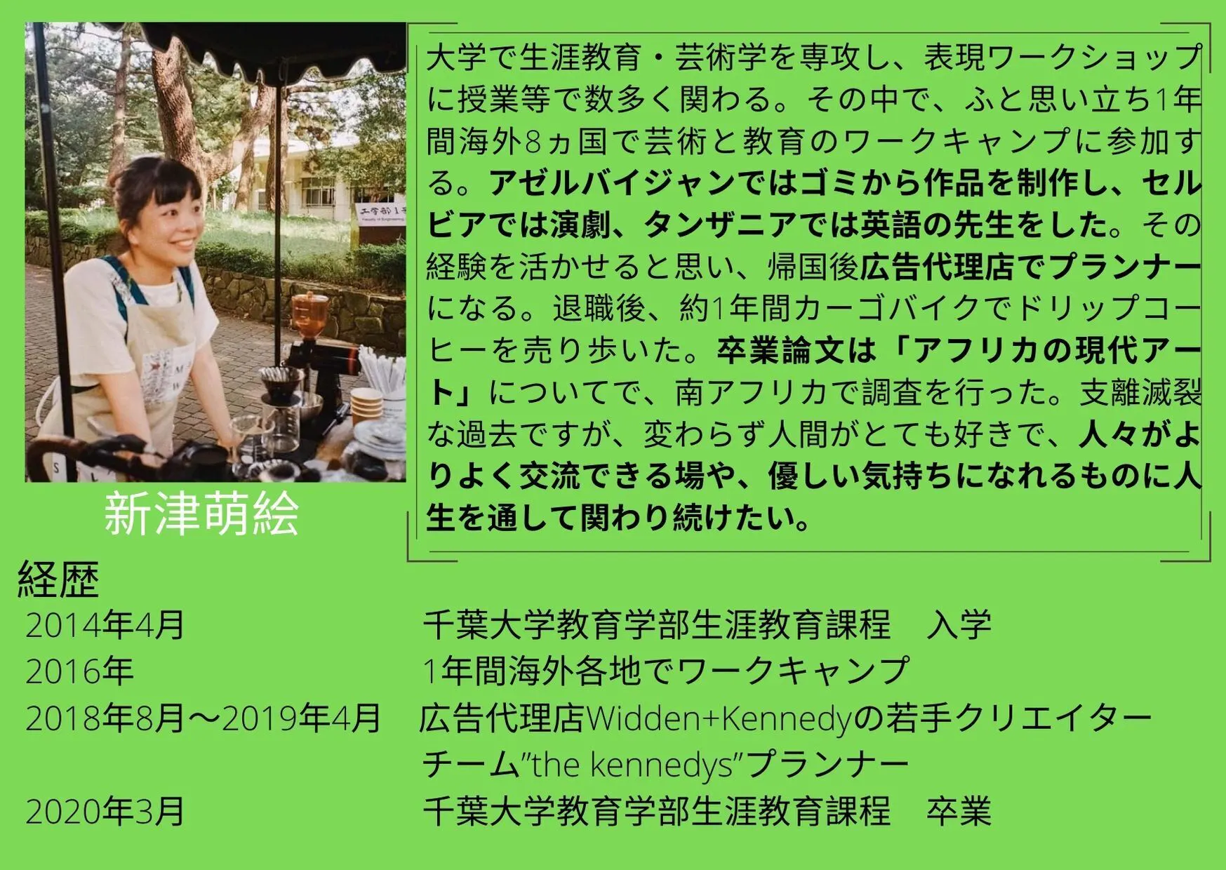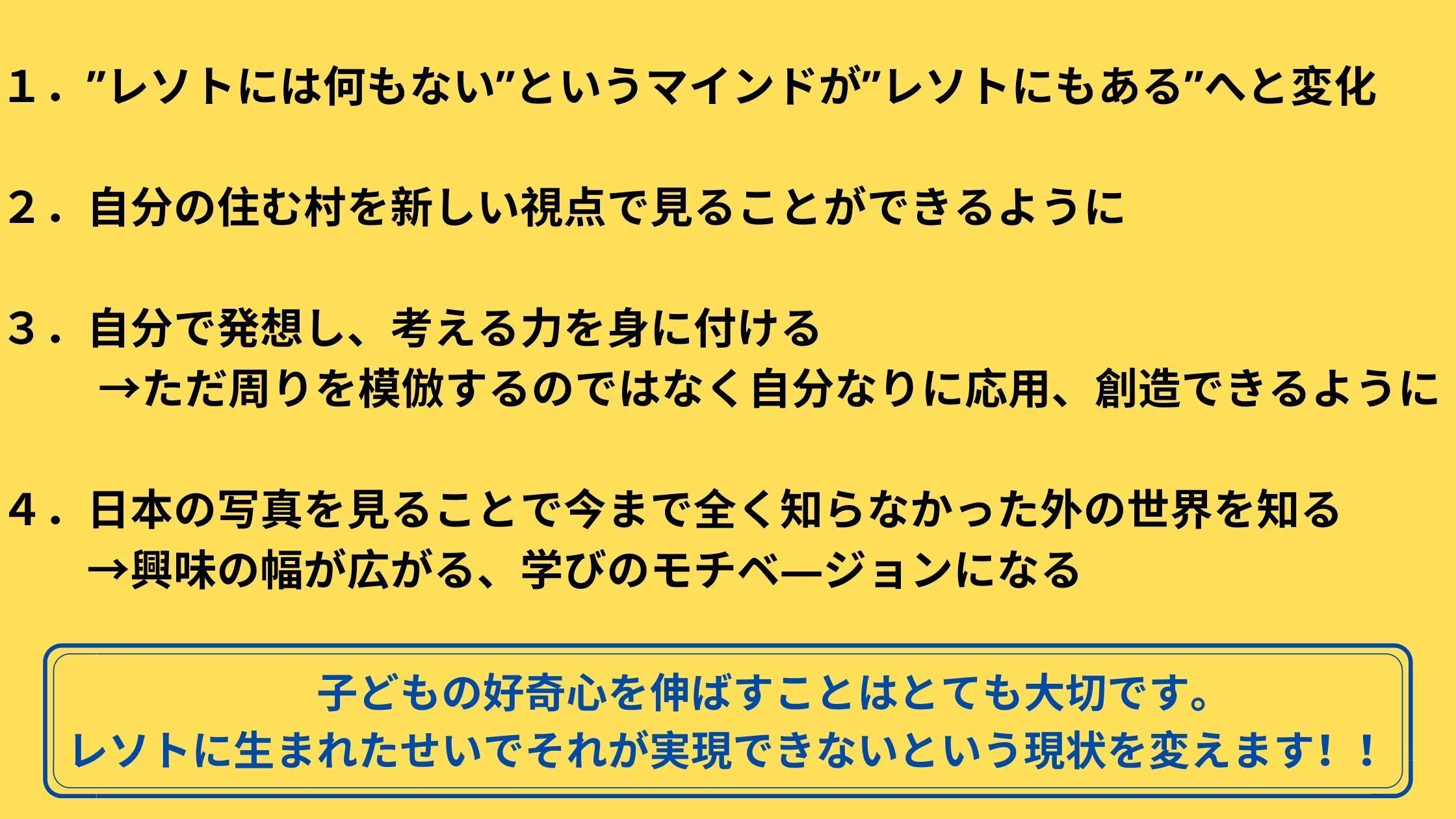 私は子どもの時からやりたいことがあれば両親がそれができるように応援してくれました。自分の興味の思うままに様々なことを体験でき、それが現在に繋がっています。写真を楽しそうに撮る子どもたちを見てこの子たちやりたい!楽しい!の部分を伸ばしたいと思いました。でも、ただカメラを渡すのではなく、カメラを撮ったり写真を見たりすること自体が子どもたちの学びに繋がるような教育プログラムを提供します!