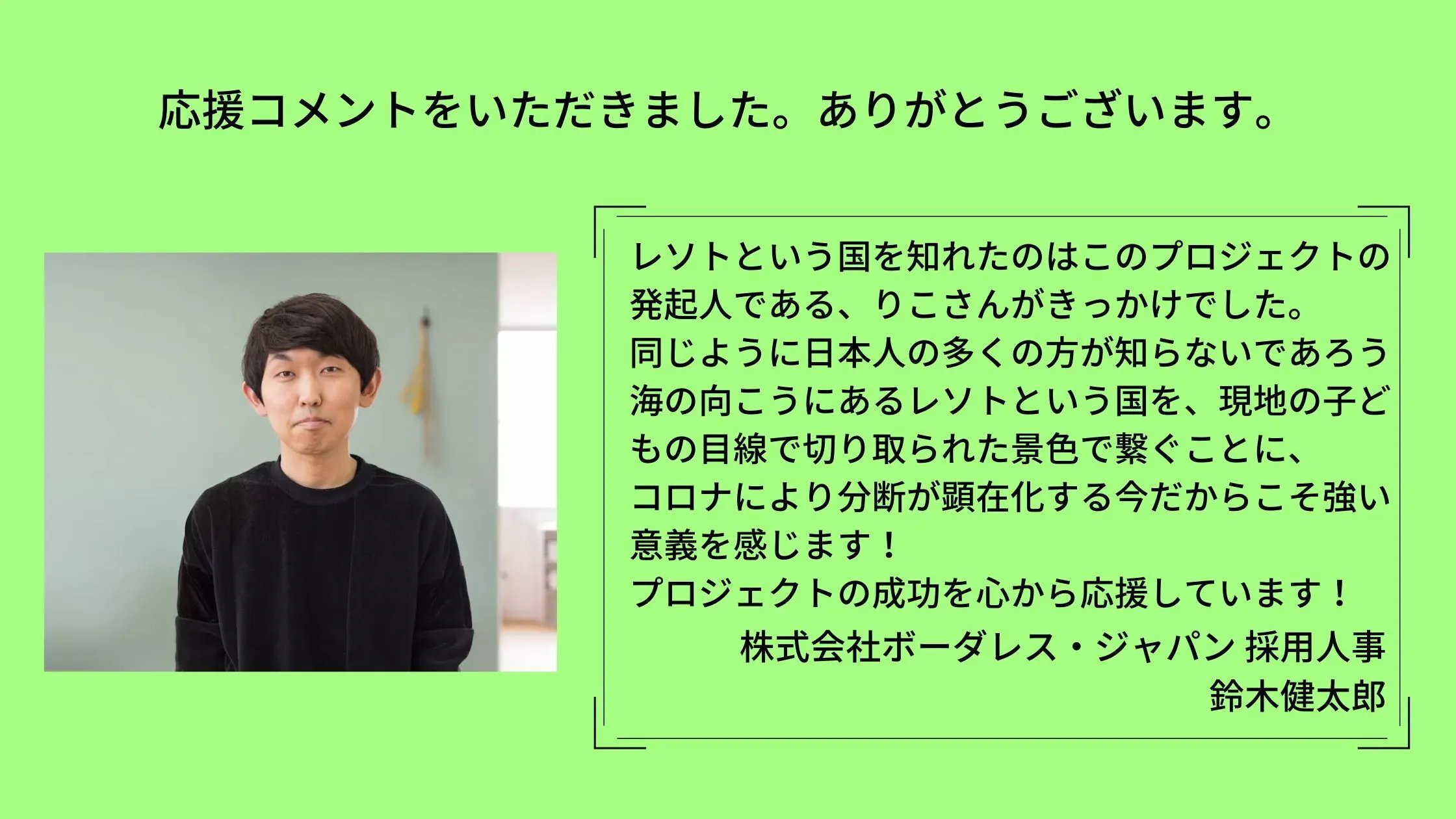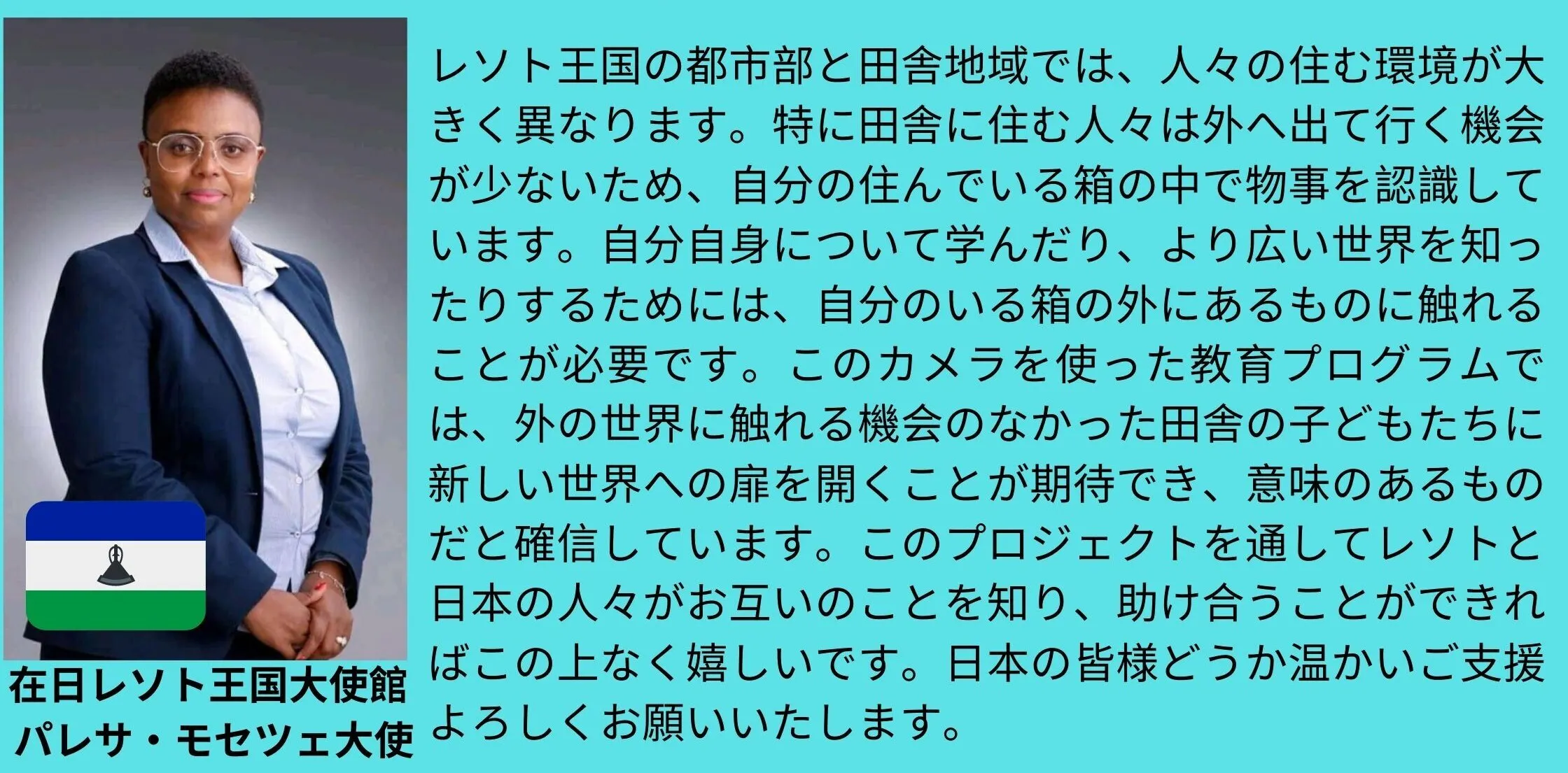 在日レソト大使館パレサ・モセツェ大使から応援コメントをいただきました。