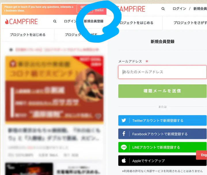 ➀キャンプファイヤーのトップページから、”新規会員登録”をクリック。もしくは、私のプロジェクトページの”支援する”を押していただき、画面右上にある新規会員登録をクリック。