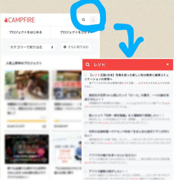 ⑤右上の検索から、”レソト”と検索してもらうと、一番上に私のプロジェクトが出てきます。