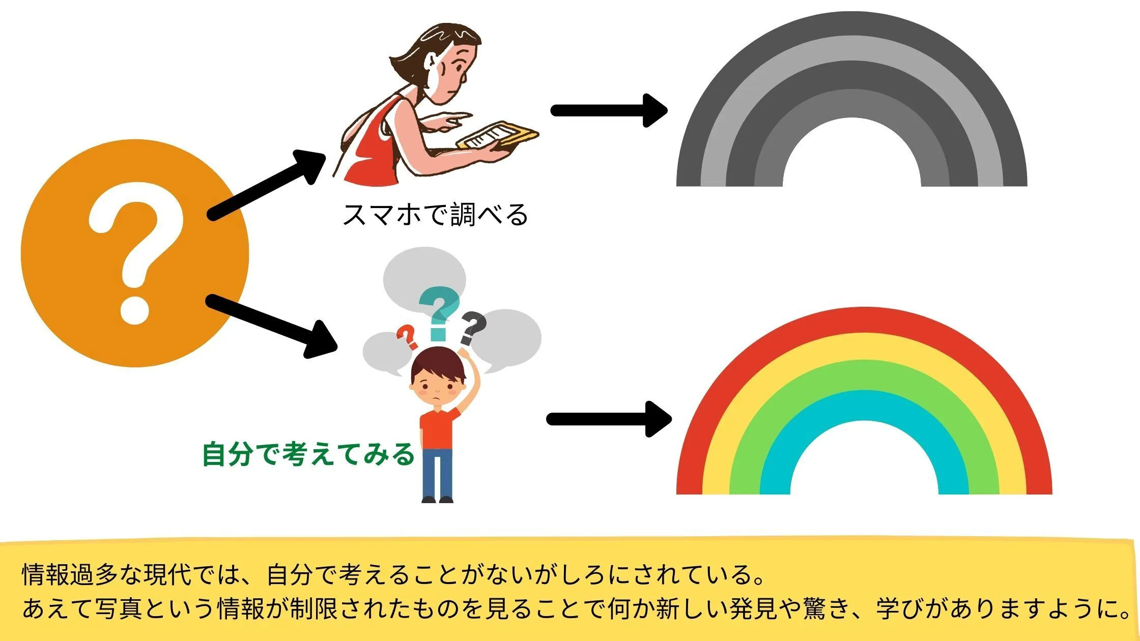 今、私たちが暮らす日本は様々な情報に溢れています。そしてその情報にアクセスすることは簡単です。何か分からないことや疑問があればスマホで簡単に調べられるからです。この過程で”自分で考える、想像する”行為が無視されています。今必要とされているスキルは、スマホで調べれば出てくる答えを覚えることではなく、自分で推測したり、自分なりの答えを見つける力を身に付けることではないでしょうか?