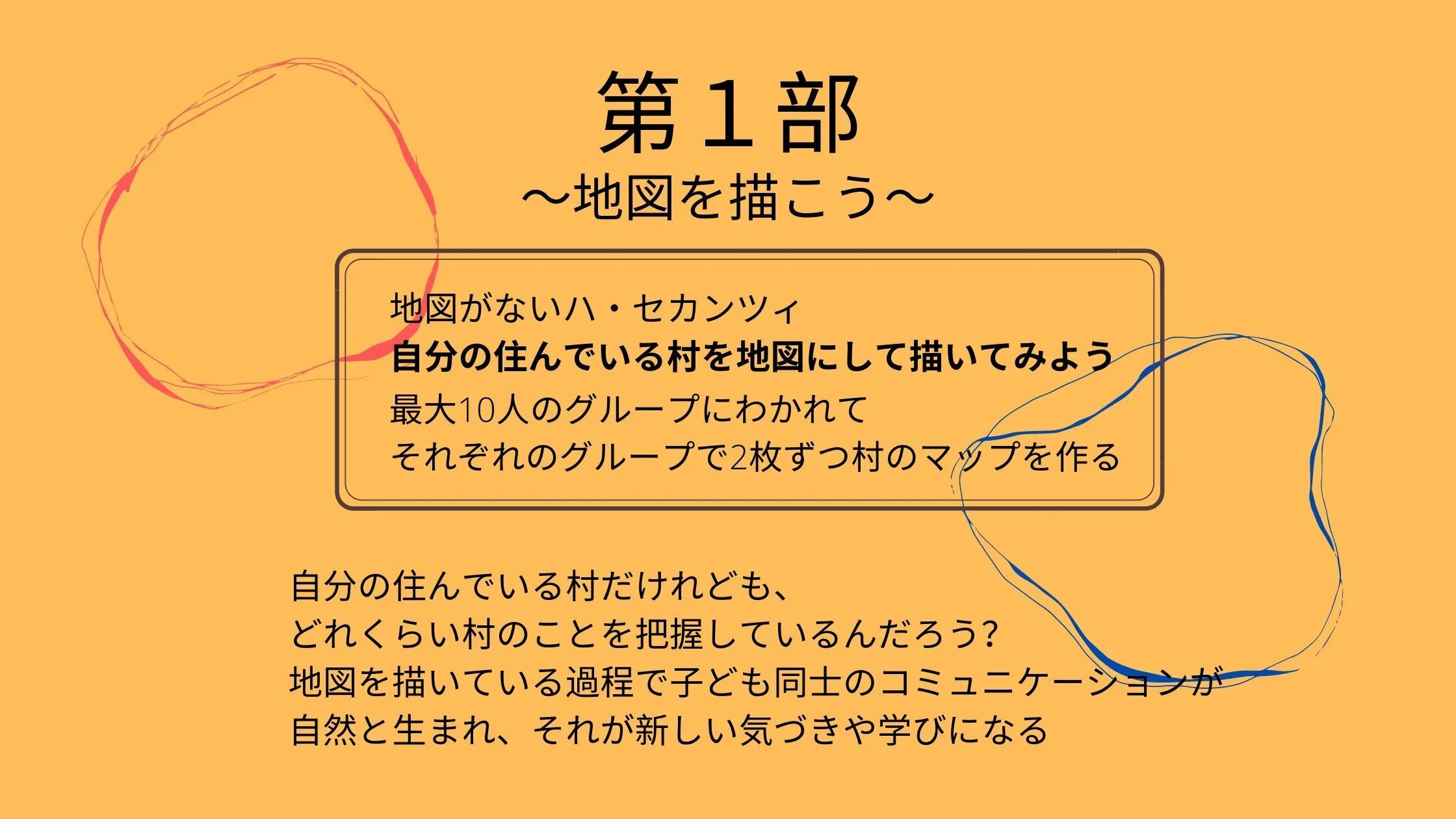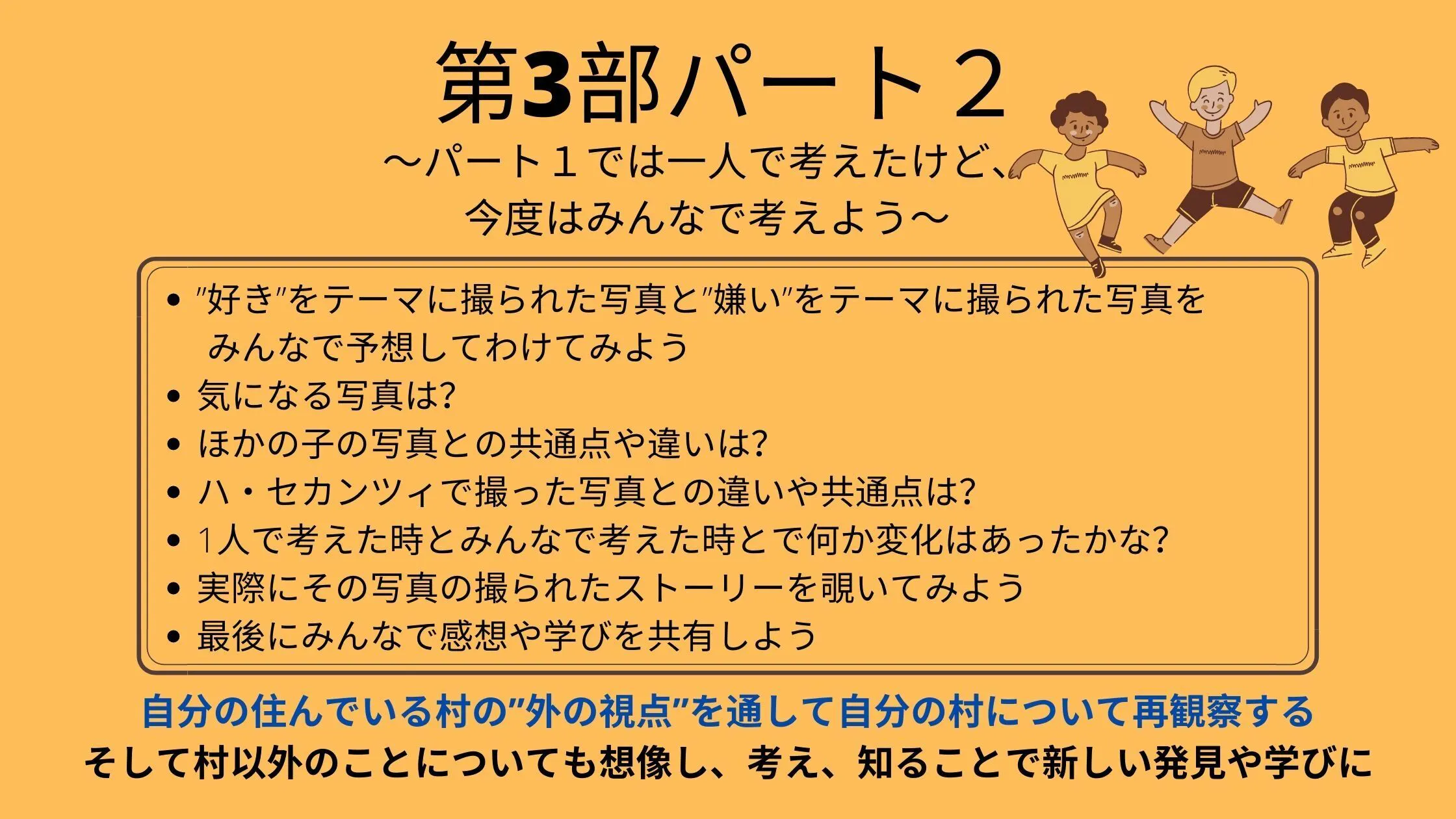 ・村には学校がなく、子どもたちは往復4時間かけて学校へ通っている。→天候によって学校へ行けるかどうかが左右されたり、登下校中に犯罪に巻き込まれたりすることもある。