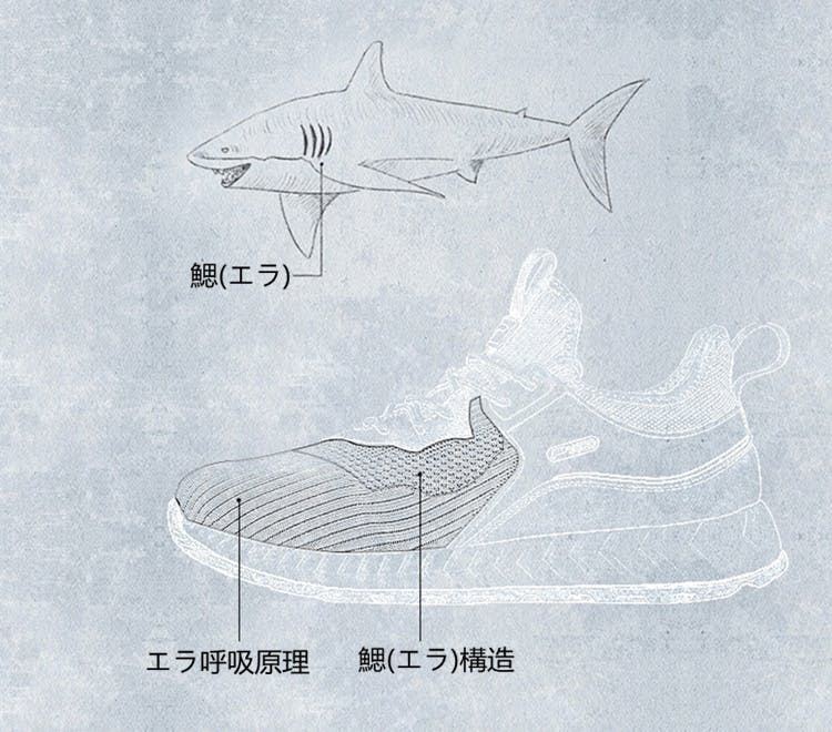 ●独自なエラ呼吸生物模倣技術採用素材を使用した新時代のスニーカー