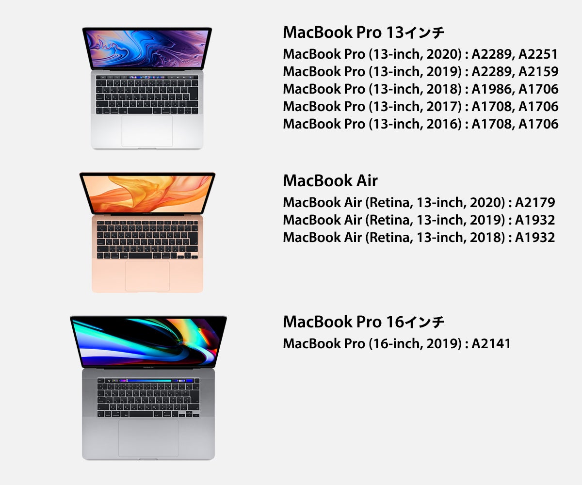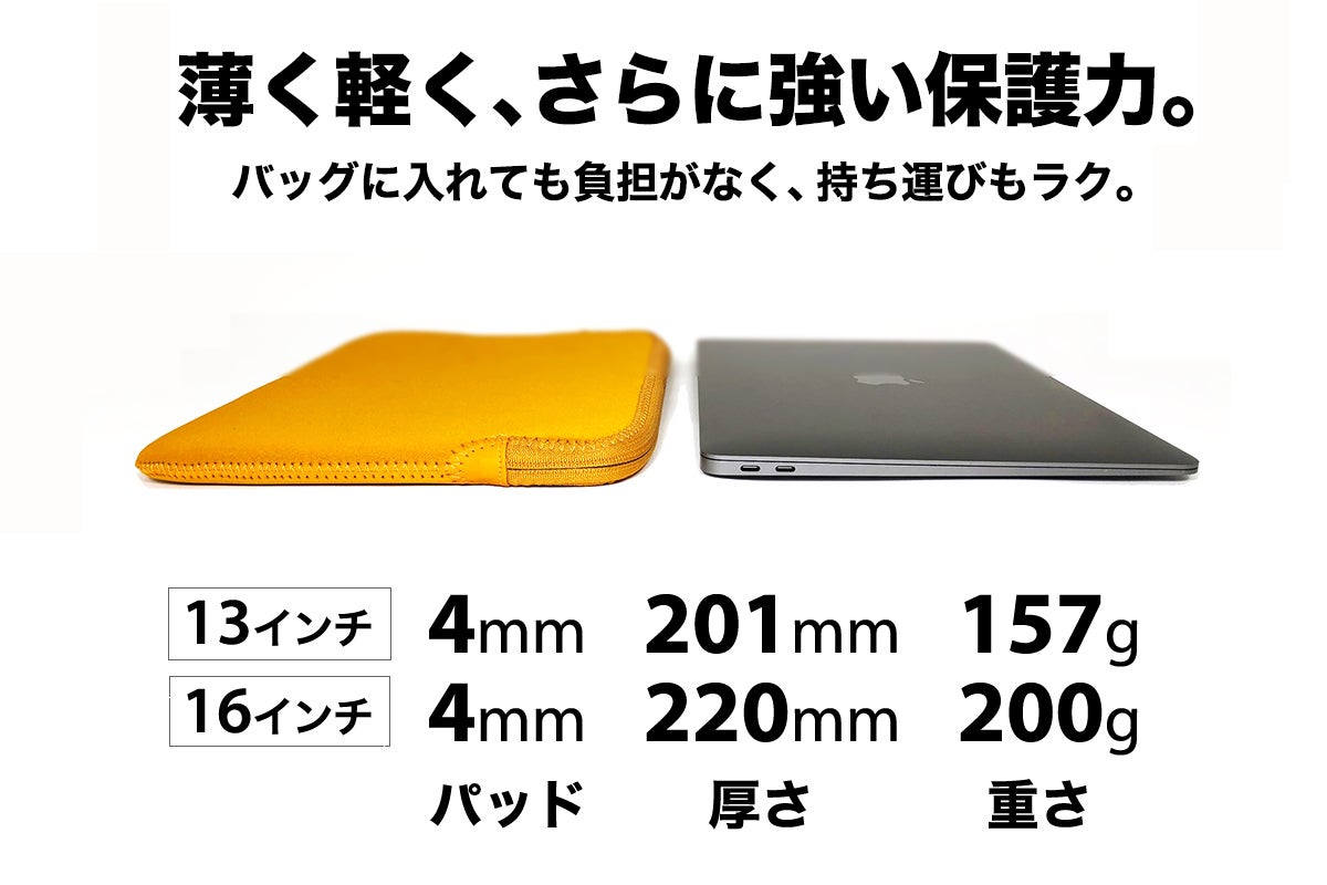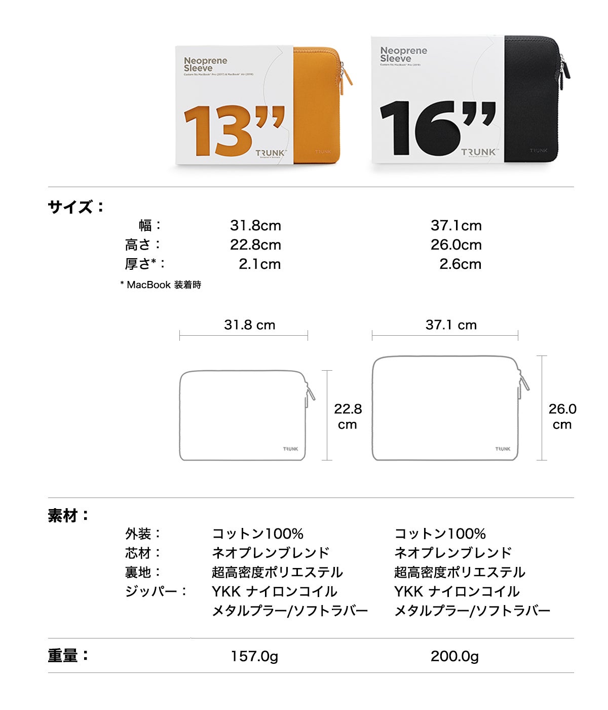 TRUNK スリーブケースは、MacBookモデルの次の機種のために設計されています。13インチは、MacBook Pro 13インチ (2020-2016)とMacBook Air(2020-2018)、16インチは、MacBook Pro 16インチ(2019)に隙間なくフィットします。
