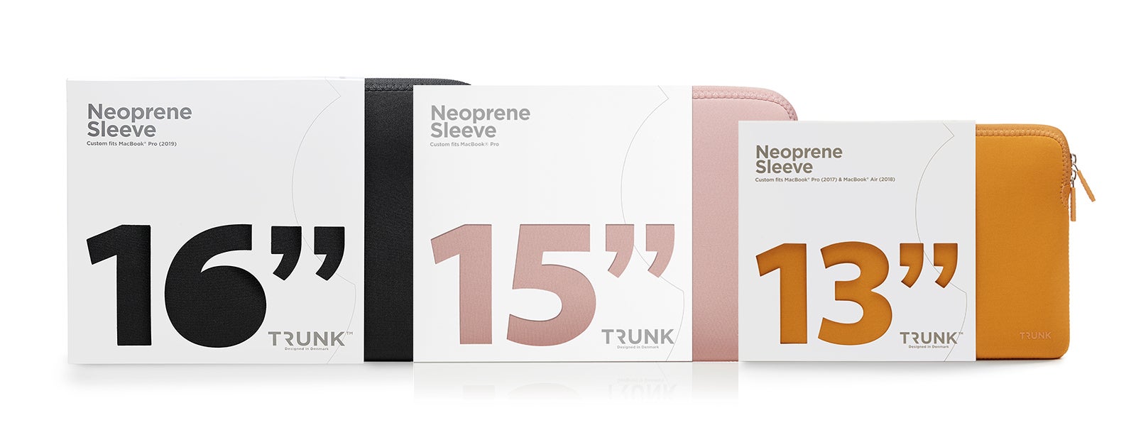 TRUNKのパッケージは他に類を見ないものです。 このパッケージングのコンセプトは、スリーブの購入時および販売時に役立ち、業務の無駄を省く、簡素化するようにデザインされています。 ユニークで目に見える型抜きサイズで誰でも一目でサイズがわかります。TRUNKは単なるブランドではなく、独特のパッケージにもブランドコンセプトが浸透しています。