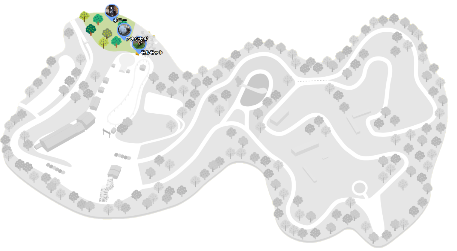 遊園地の観覧車の下にあり、ポニー・ミニチュアホース・ミニブタ・ウサギ・モルモットなどが展示されています。