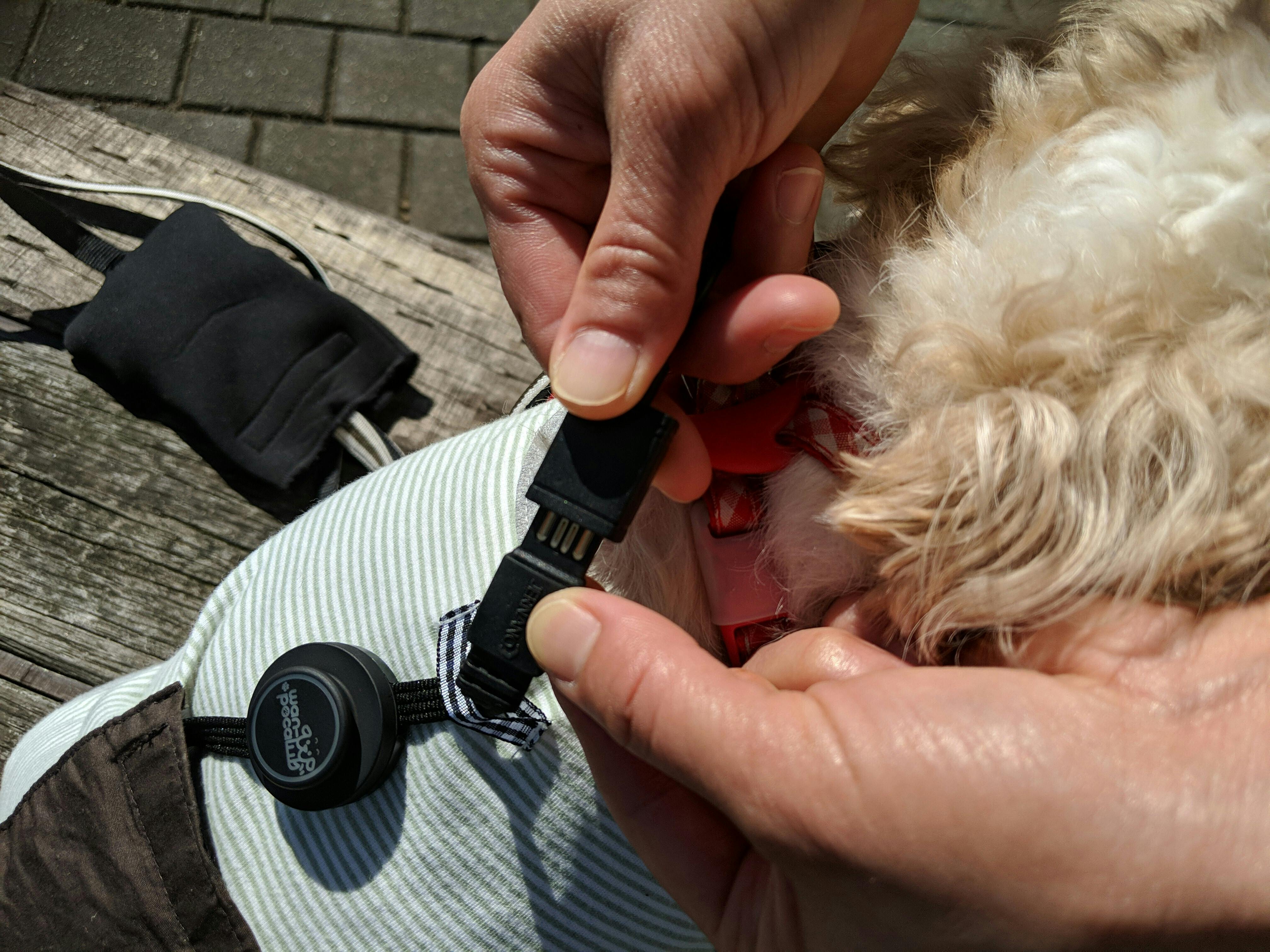試行錯誤の結果、飼い主さんに持って頂く事でワンちゃんの負担をゼロにする事にしたのです。いえ、厳密にいうとリード・USBケーブル・モバイルバッテリーポケットを一体化しオールインワン型にする事で、飼い主さんのご負担も軽減する様にしました。