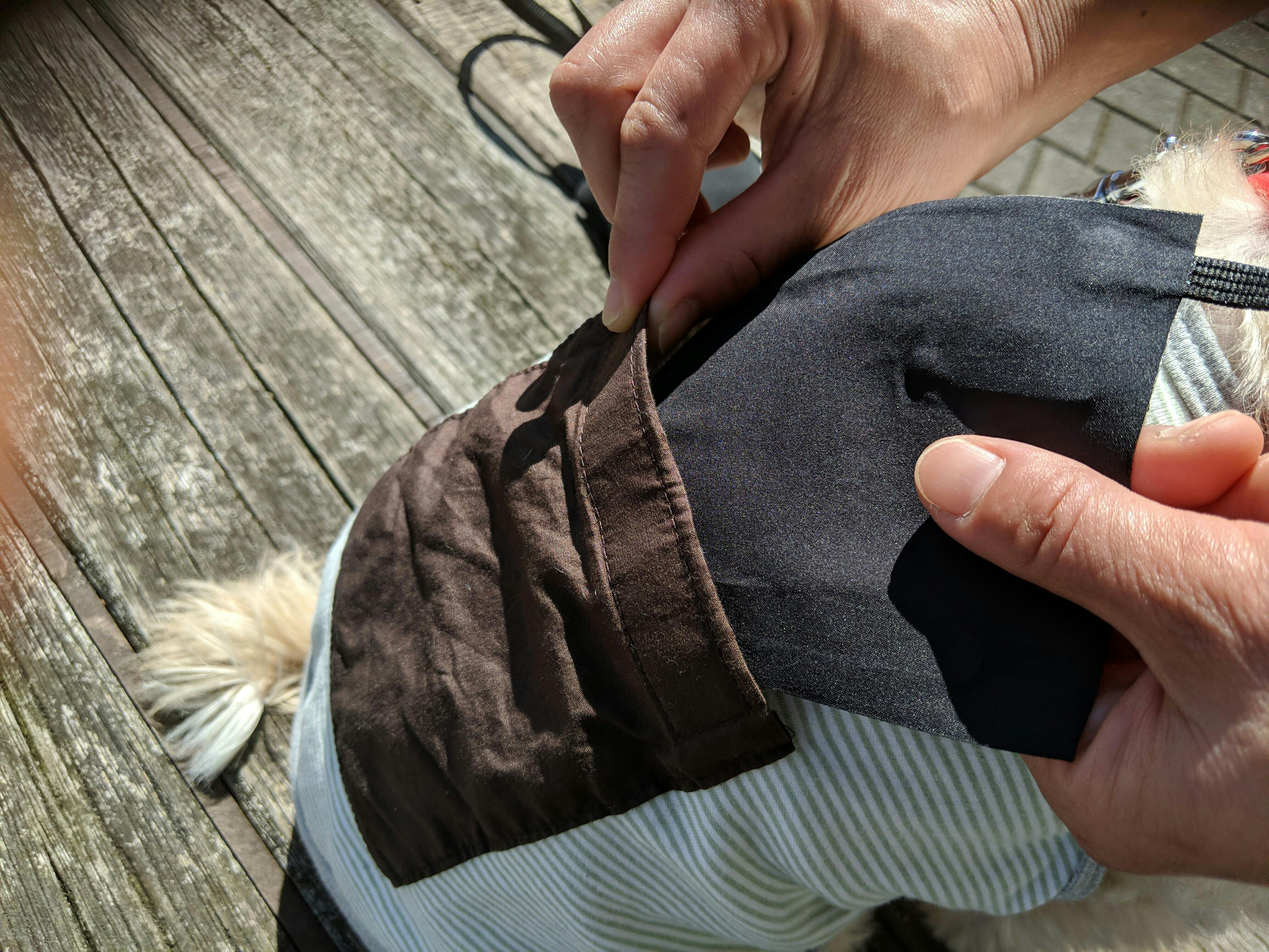 次はフィルムを入れることのできるウエアの制作です。背中を中心に全身を温めることが出来るので重くて厚い素材である必要はありません。何よりもワンちゃんの動きやすさを重視して、柔らかく薄手の素材・形はタンクトップに決定しました。