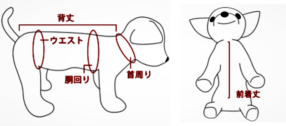 実際に愛犬のサイズを測るときの注意点です。採寸する際はワンちゃんを水平に立たせ、メジャーで測って下さい。