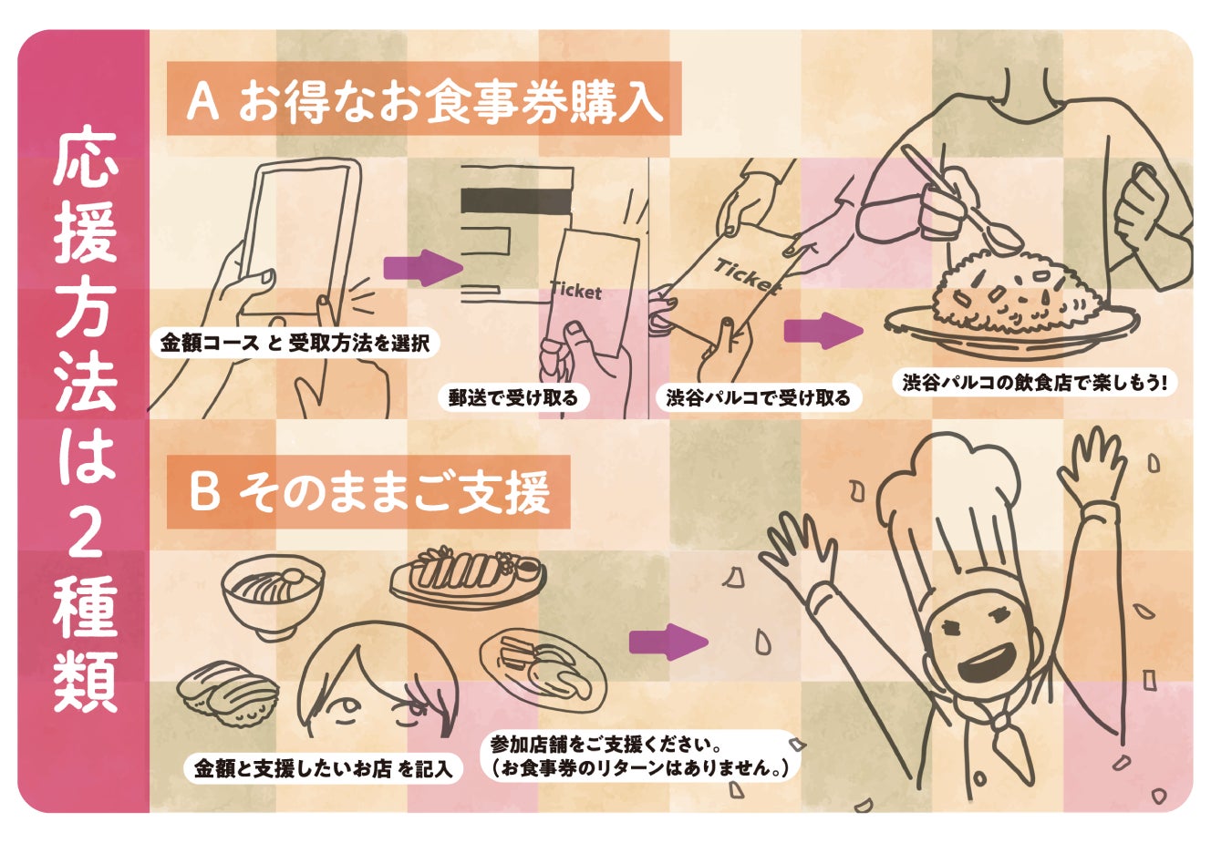 新型コロナウイルス影響によって苦境に立つ飲食店の売上・収入減少等を軽減するため、チケット(お食事券)を事前に購入することで、飲食店を支援するプロジェクトです。「パルめし」チケットは、渋谷PARCOの飲食店で便利に「どこでも自由に使える」お食事券です。