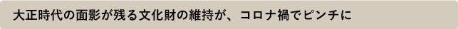 これまでも、東日本大震災をはじめとする天災で苦境に陥ってきましたが、今回の新型コロナウイルスの影響は先が見えず、頭を悩ませています。同じように各地で文化財を守り続けている仲間からは、建物の解体を考えざるを得ないほどの危機だ、との声も聞かれます。