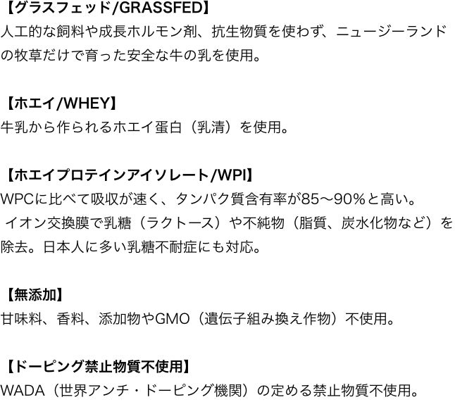 ●本品原料のWPIプロテインに関するWADA(世界アンチ・ドーピング機関)規程禁止物質不使用の根拠は、2021年1月時のWADA禁止物質一覧に拠るものです。
