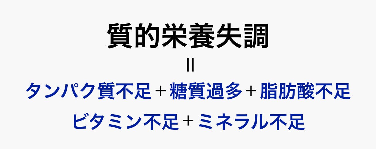 分子栄養学では、必要な栄養が慢性的に不足している状態を「質的栄養失調(新型栄養失調)」と呼びます。バランスが取れた食生活を送っているつもりでも、無自覚のうちに陥りやすいのが質的栄養失調。その原因は「タンパク質不足+糖質過多+脂肪酸不足+ビタミン不足+ミネラル不足」と言われています。