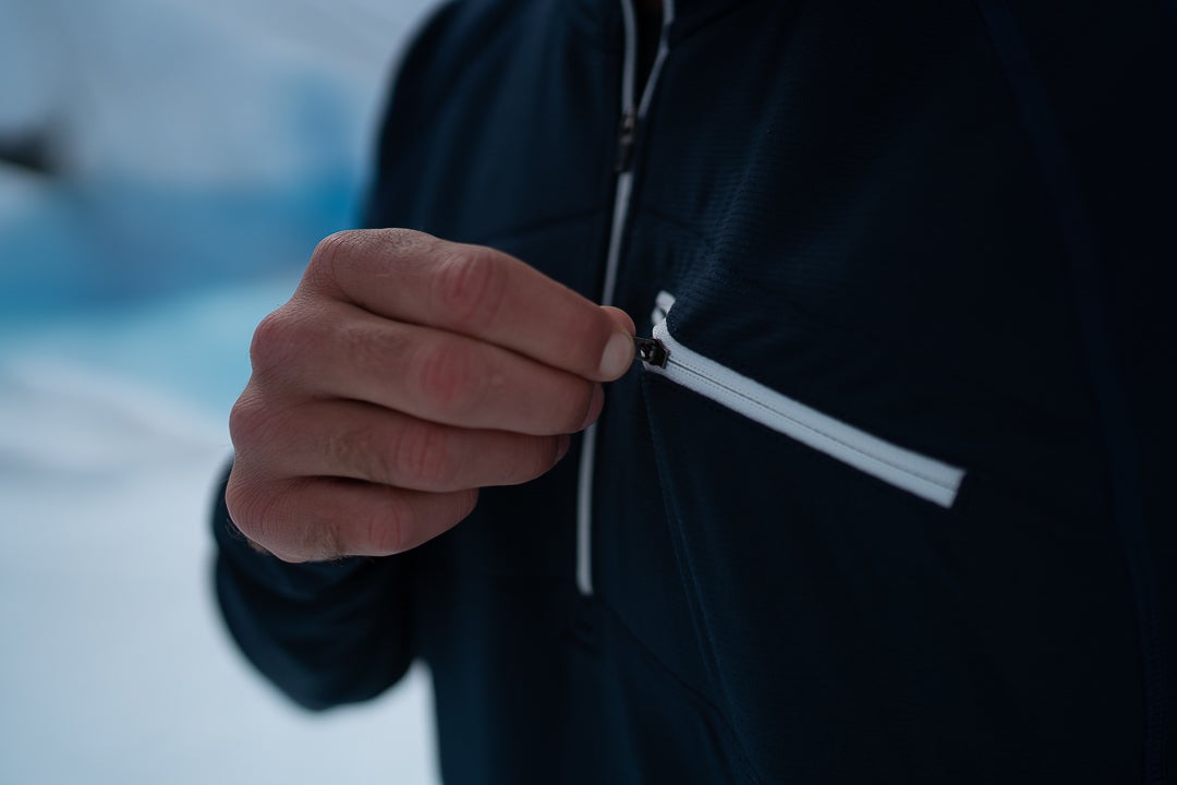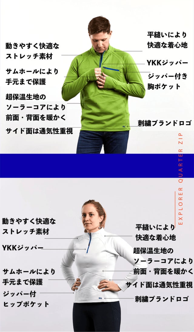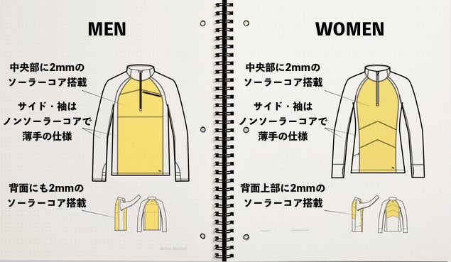 クオータージップには前面と背面に2mmの特殊素材"ソーラーコア"が搭載されています。この生地により、動きやすさを確保した状態で体温を暖かく保つことを可能としました。