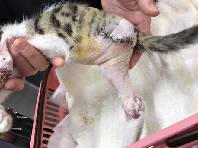 義母が浪速区の方に用事で向かっていたところ、大雨の中どこからか「ミャーミャー」とか細い声が聞こえてきたらしく、辺りは夕方で薄暗かったためよく見えず、声の行方を捜したところ、道路の真ん中でうずくまって鳴いているハッピーを発見しました。雨のせいで状態がよく見えなかったこともあり、ここにいては危ないので移動させようと抱き上げたら、痛みと恐怖のせいで物凄い勢いで噛みついてきたそうです。その足で早急に考える間もなく近くの動物病院に駆け込み、応急処置後、雨が降っていたということもあり、一晩預かってもらっていたそうです。私たち他の家族はそのことを次の日に我が家に義母が連れ帰ってきてから初めて知りました。何も説明なく段ボールに入れて帰ってきたため、私は咄嗟にたくさん他の子たちもいるのでこれ以上は無理とその時思いましたが、箱の中を見て愕然としました。四肢とも違う方向に曲がり、それでも懸命に這って動こうとする姿です。とりあえず、駆け込んだ病院でリンパ液がたまりパンパンに腫れ、化膿の恐れがある後ろ足、無数にある傷口の手当て、及び抗生物質の処方薬を一週間分頂きましたが、当院ではこれ以上の治療は無理との事だったので、手術が出来る病院を紹介して頂きました。