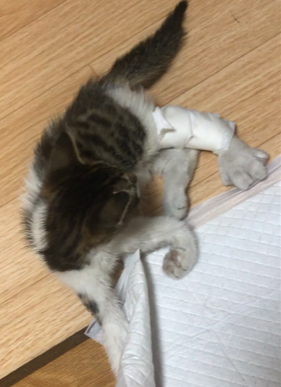 紹介して頂いた病院に連れて行ったところ、こんなに酷い状態だとは電話では伝わっていなかったらしく、子猫ということもあり、一番に命を優先し、体力的に無理のない手術を先生たちが選択。早急に先生たちで入念なミーティングをして頂き、その日の18時から手術開始。およそ三時間にわたる大手術でした。次の日、面会に家族で向かったところ、体調は良く、肺にも穴が開いていたけれど自分で自然治癒しようとしているので、無理に人の手を加えて体力的にも負担をかけるのはよくないみたいでした。右前足は唯一骨に異常はなかったのですが、神経が損傷しているらしくもう動かすことができないようです。今後その前足を本人が移動する際、邪魔になりストレスを感じるようになれば切断しなければならないようです。
