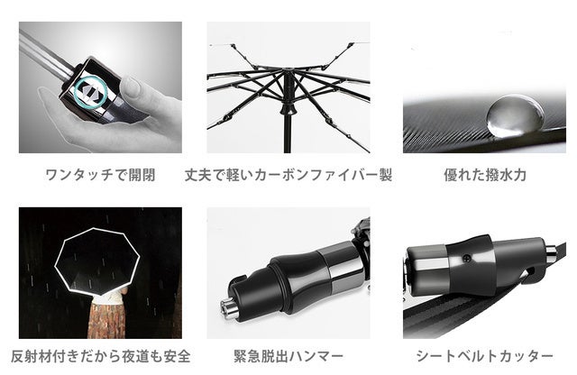 【機能】緊急時脱出用ハンマー内蔵/シートベルトカッター内臓/撥水生地/自動開閉/99%UVカット