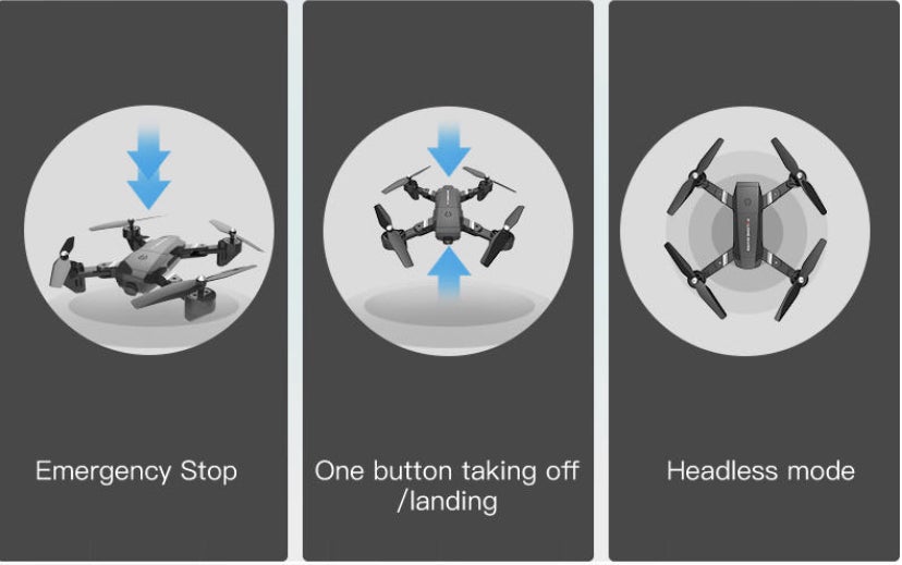 ②ワンボタン式:ワンキー離陸・着陸機能搭載で、ボタンを押せば初心者でも簡単にドローンを空中に飛ばしたり、地面に戻したりすることができます。また、ドローンが遠くまで行き、飛行状態が確認できなくなった場合は、リターンボタンを押せば、ドローンがそばに帰ってくるので、ドローンの暴走や紛失を防ぎます。