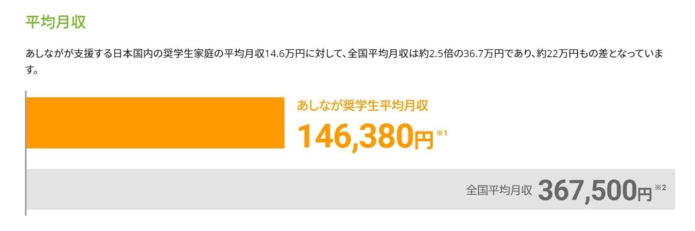 あしなが育英会の調査によると、遺児家庭の平均月収は14万6,380円(*1)となっており、生活保護受給率は12.8%24(*2)に及びます。奨学金なしでは大学・専門学校の学費を捻出できる水準には到底達していません。