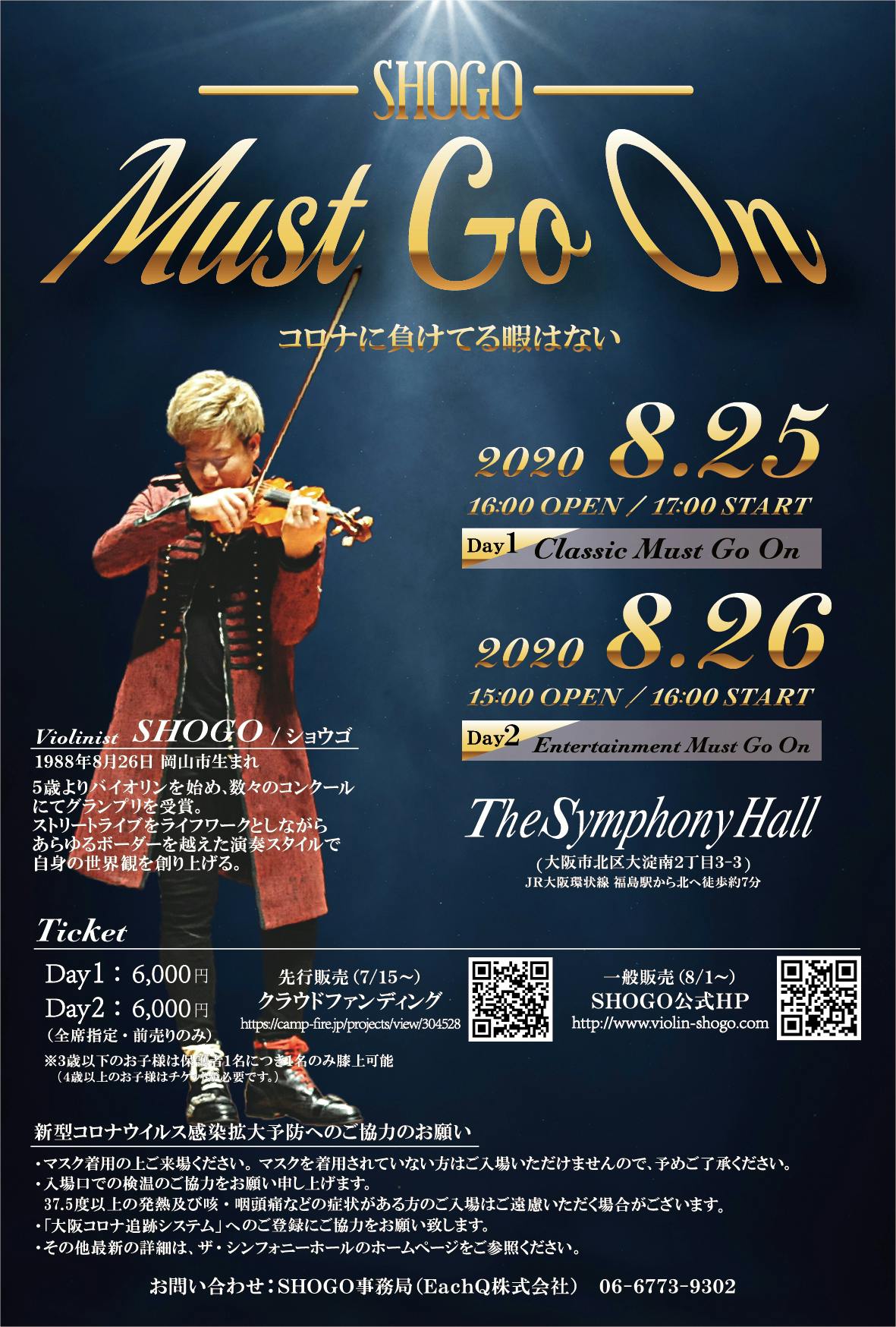 2020/08/27 20:072020年8月25・26日SHOGO Must Go On ~コロナに負けてる暇はない~多くの皆様に支えられ、無事に終えることができました!一年前のフェスティバルホールで発表してから一年…。思いがけない状況の変化もありながら、本当にコンサートが開催できるのか、開催して良いものかとギリギリまで悩みは絶えませんでした。また、今回は初めてクラウドファンディングにも挑戦し、これまで以上に多くの人にご協力いただくことができ、無事にコンサートを開催、終了することができました。ご来場いただいた皆様をはじめ、クラウドファンディングにご協力いただいた皆様、コンサート開催に携わってくださった多くの皆様に心より感謝申し上げます。本当にありがとうございました。動画配信等でより多くの人に音楽が届けられるようになりましたが、今回のコンサートで生の音楽の良さが皆様に伝わったかと思います。今回はSHOGOにとっても大きなチャレンジとなりましたが、これをきっかけにエンターテイメント業界がより良い方向にむかうかもしれません!そして最後になりましたが、ご協賛・ご協力いただきました企業・団体の皆様にも感謝申し上げます。ありがとうございました。SHOGOはこれからも前へ進み続けていきます。Violinist SHOGOをどうぞよろしくお願いいたします。 もっと見る