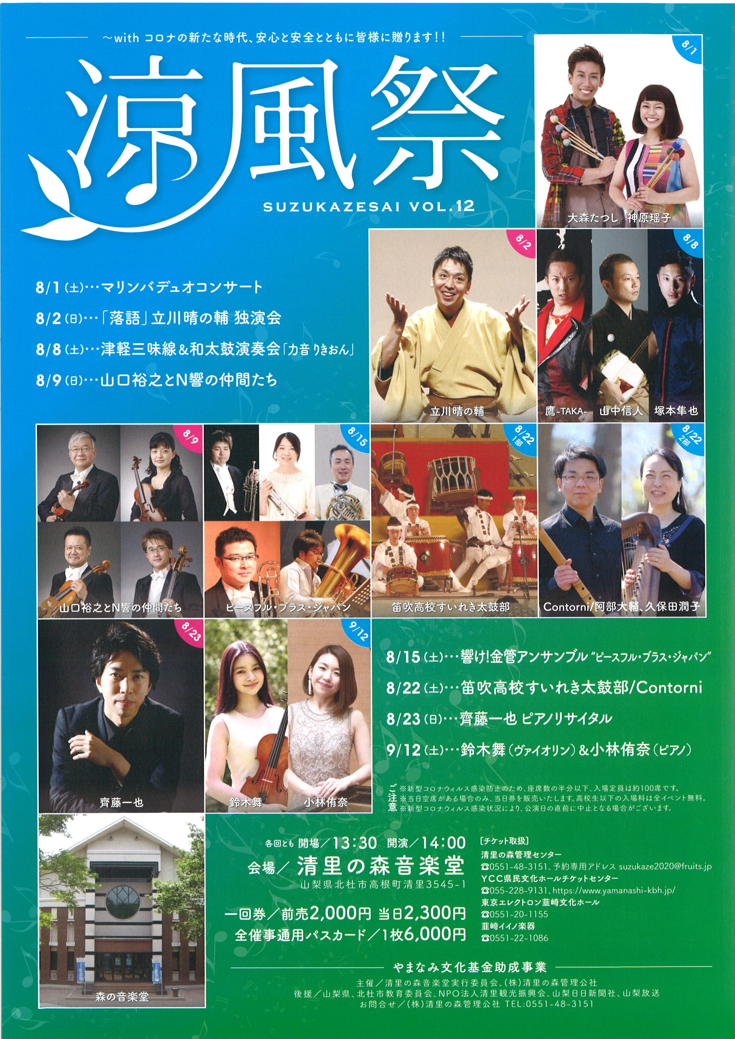 清里の森は八ヶ岳南麓に位置する別荘地で、センター地区にはテニスコートやパークゴルフコースなどのアクティビティの他、森の音楽堂があります。この音楽堂から文化芸術を発信しようと、11年前から有志で結成した清里の森音楽堂実行委員会が毎年夏のイベントとして「涼風祭」を企画・運営しています。