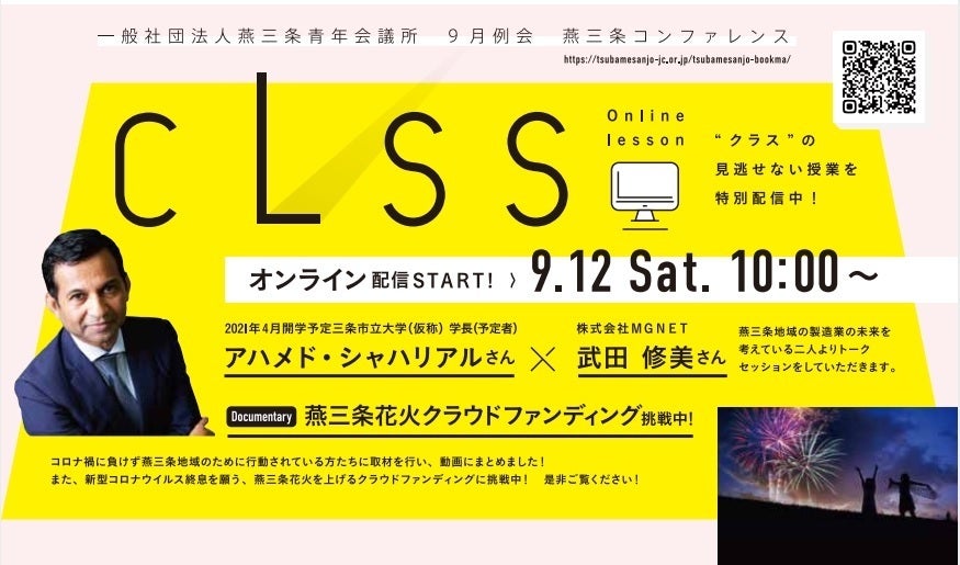 9月12日(土)『class 暮らすをマナブ』をコンセプトに、住み暮らす燕三条地域のあるべき姿について考え、学ぶコンファレンスを1つの学び場として考え、その中で3つの事業を開催します。